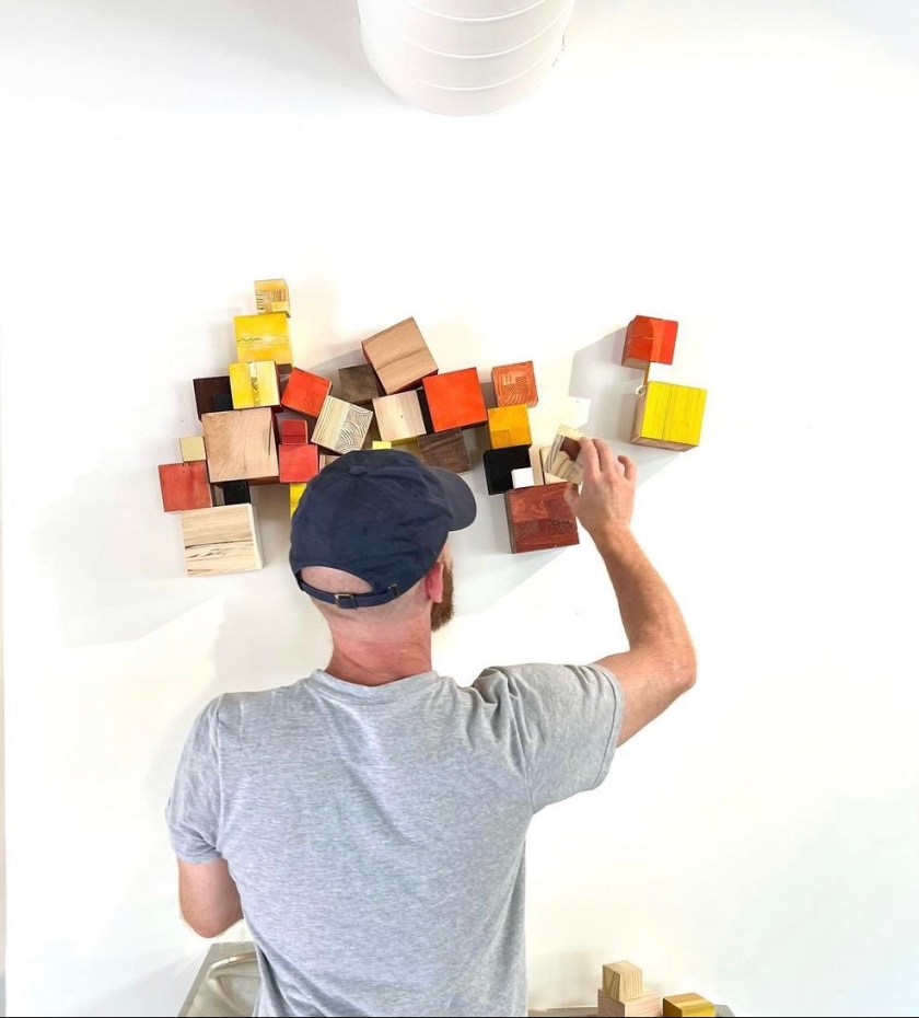 Curated by Charlotte Russell and on view at Hartwell in Raleigh, Experiments in Form features artworks by five Triangle-based artists, Sterling Bowen, Abie Harris, Mar Hester, Pete Sack, and Natalia Torres del Valle. Through their own unique process and materials, each artist experiments with spontaneity vs. control, interconnectedness, and the process of making. Below is a pic Charlotte caught of me installing an original composition made just for this show.