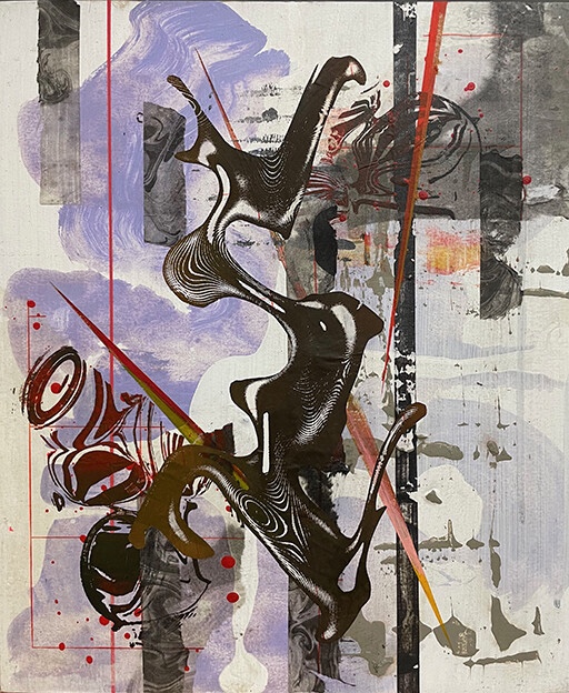 makes paintings in a variety of media and installations (he notes that painting today “has to negotiate its place in a rapidly emerging technological environment” and that nonetheless he affirms “the vitality of the physical even as interiority and the embodied seem diminished in the face of the virtual.”