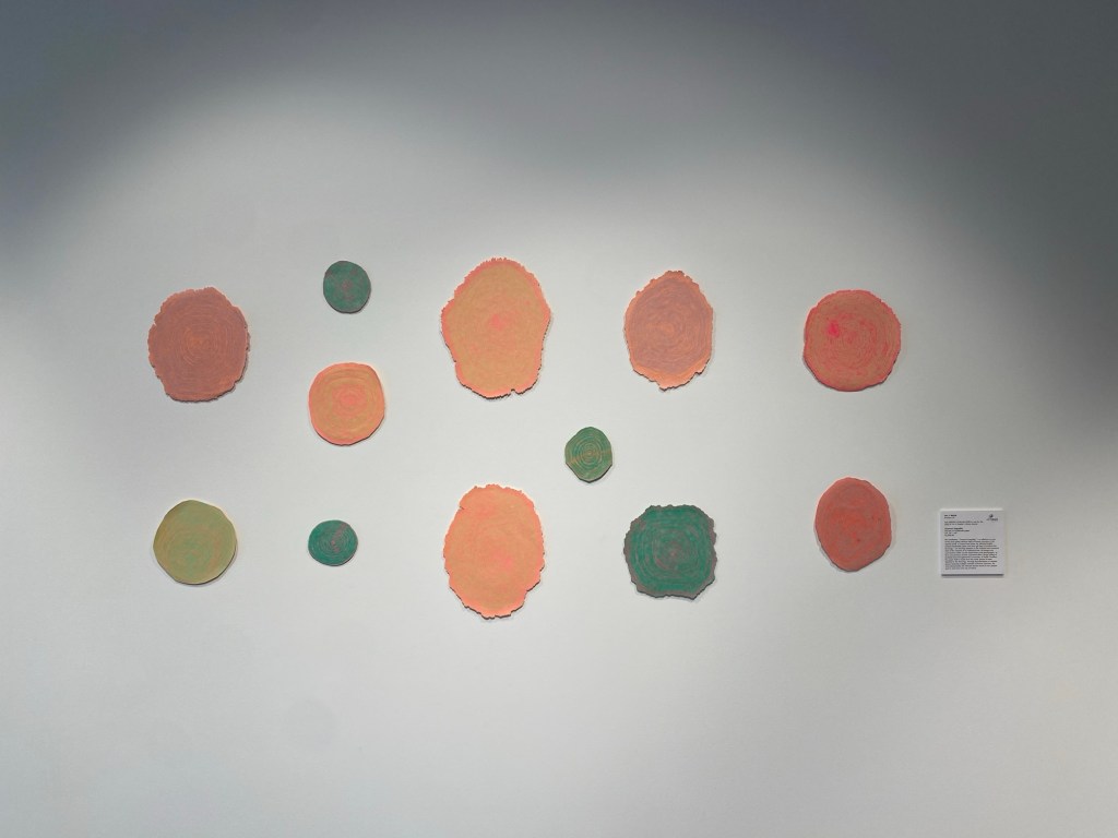 About this installation, Ian says “Crosscut (Log-pile), is a reflection on one of the most quietly obvious signs of human incursion in the natural world: a crosscut tree stump. By utilizing brightly colored handmade paper and neon gel pens to produce the drawings, I am drawing attention to the artificial and unnatural state of the remnant of an individual tree. All images are sourced from either on-site observations and photographs, or from cross-sections of trees recovered after a large culling of forested areas throughout the Lowcountry of South Carolina; the paper itself is mostly from the same species of trees depicted in the drawings.”
