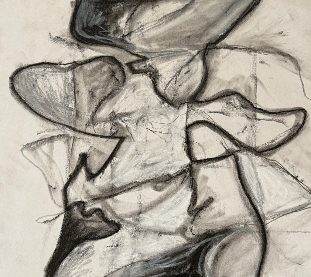 The project started with the early 20th century Surrealist parlor game Exquisite Corpse, where the collaborative joining of unrelated ideas yields novelty, contradiction, and the unexpected. This process of dismantling and reassembling branched into other strategies of disruption: attempting to suppress the conscious mind through the act of automatic drawing; using frottage, asemic writing, and collage to deconstruct meaning or remove it entirely. Some samples of the some of the drawing I’ve generated are below- quite different from hard-edged squares within squares. Show statement follows.