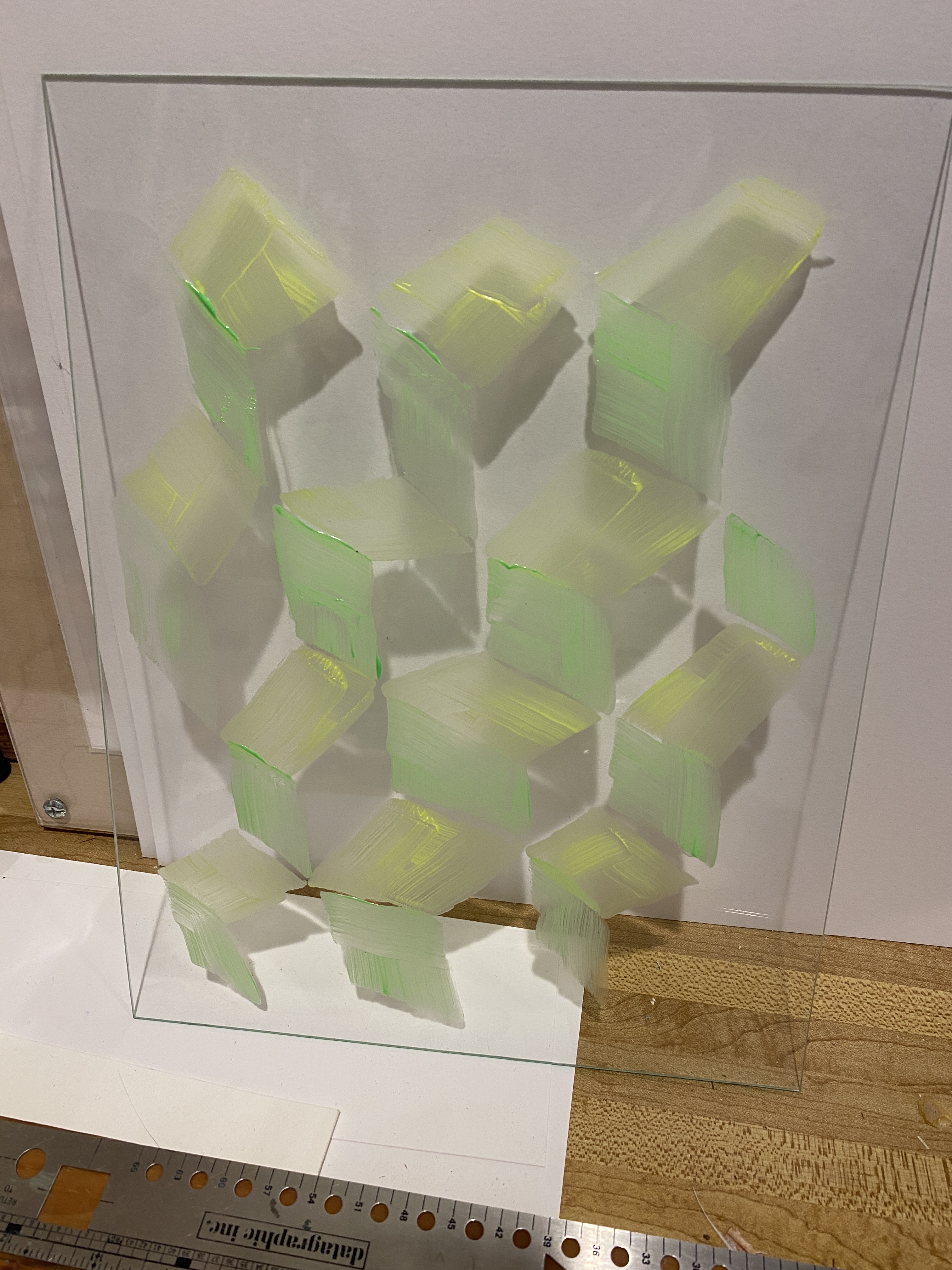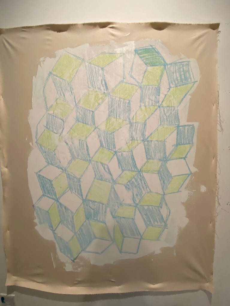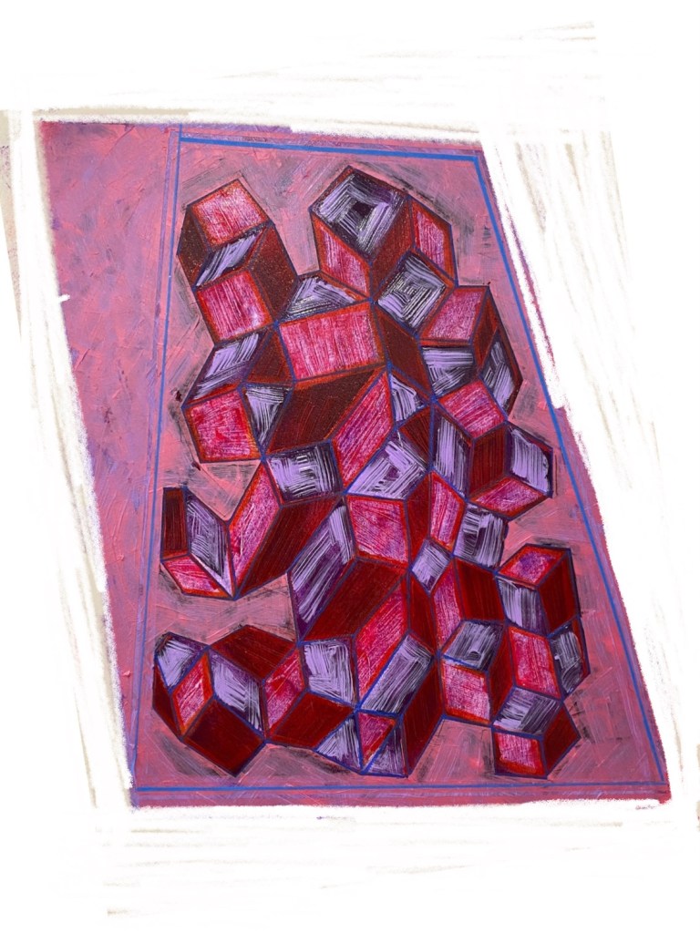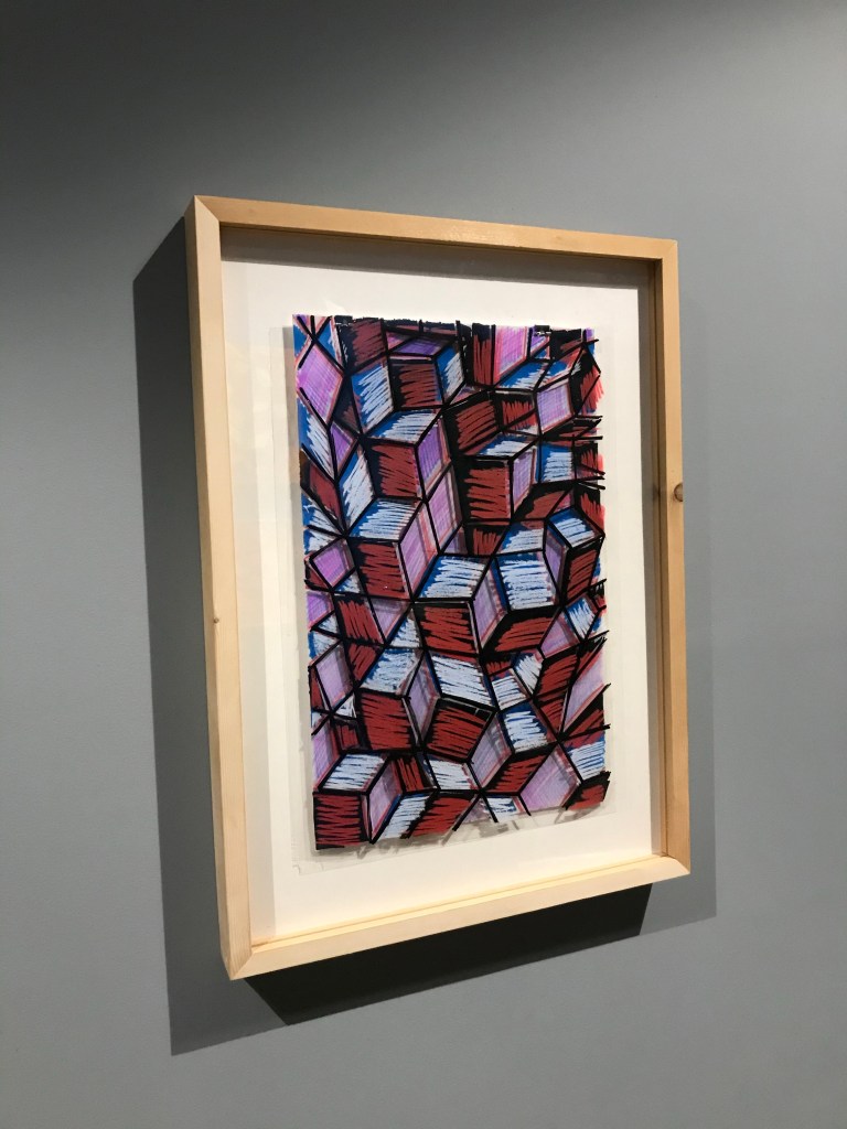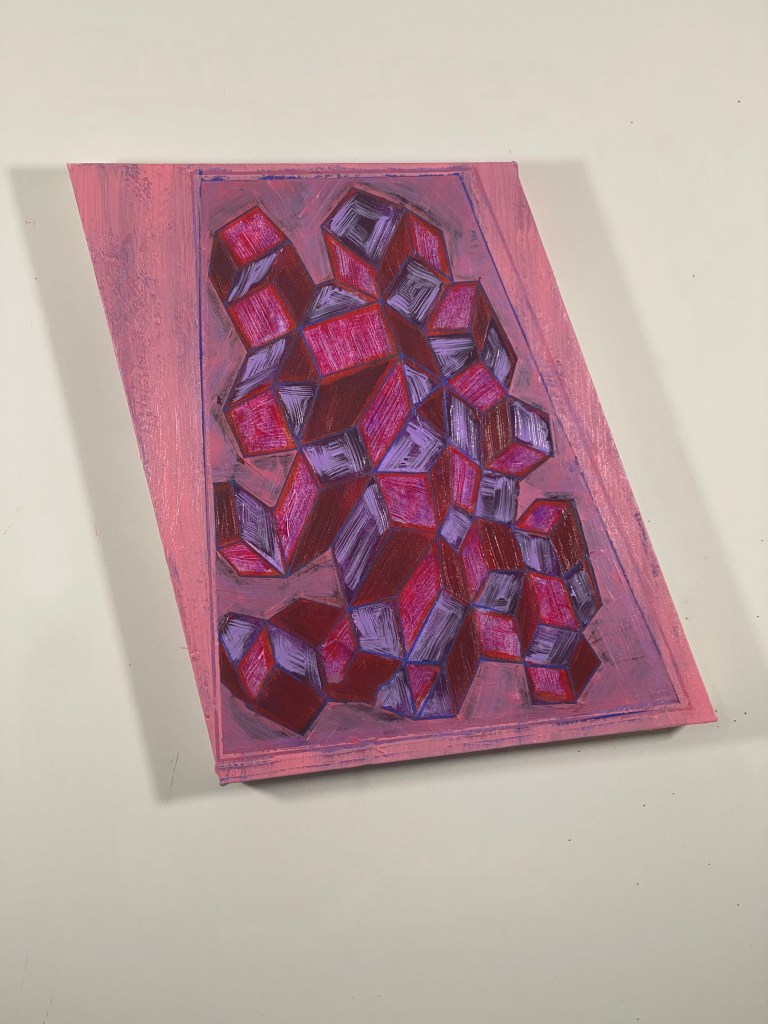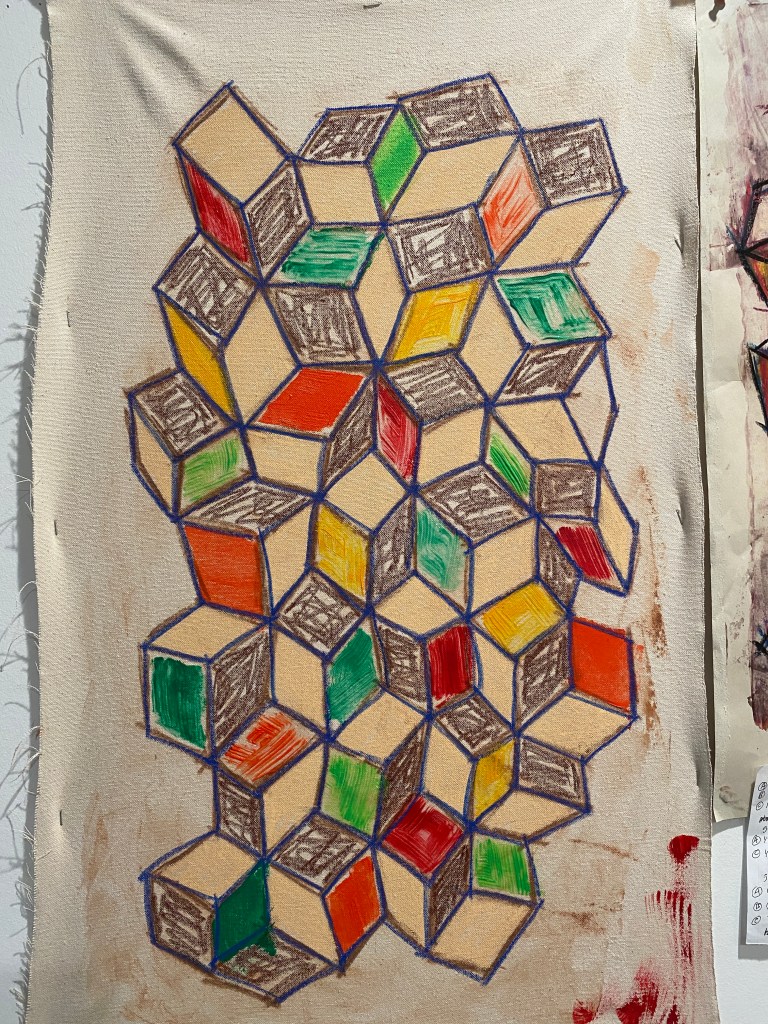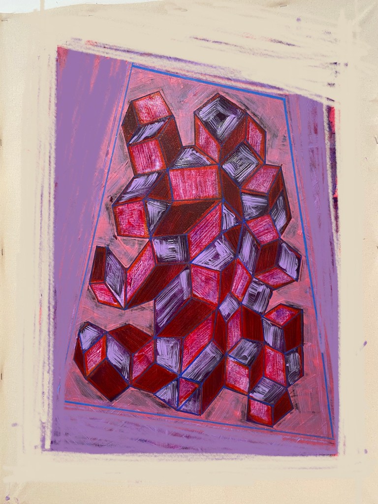 One other material that I have rediscovered recently is pastels. The left image below is a drawing I did that is the reason I began drawing my way through Oblique Strategies when I was feeling stuck. I hope the reader will agree that the color in this piece was worth exploring as a painting study (last row) that I’m pleased to report has ended, and there’s now a 5′ x 5′ piece of canvas stapled to the wall of my studio, ready for me to embark on a larger piece. I’m happy with the framework I’ve built for this one- lots of room to make in-the-moment decisions- and the composition will happen the way much good abstraction does, by stepping up to a blank canvas and being present in the moment. I will do the drawing using the overhead projector but only so that I can make slight tweaks to the size of the cubes, by changing the distance between the projector and the wall) if I desire.
