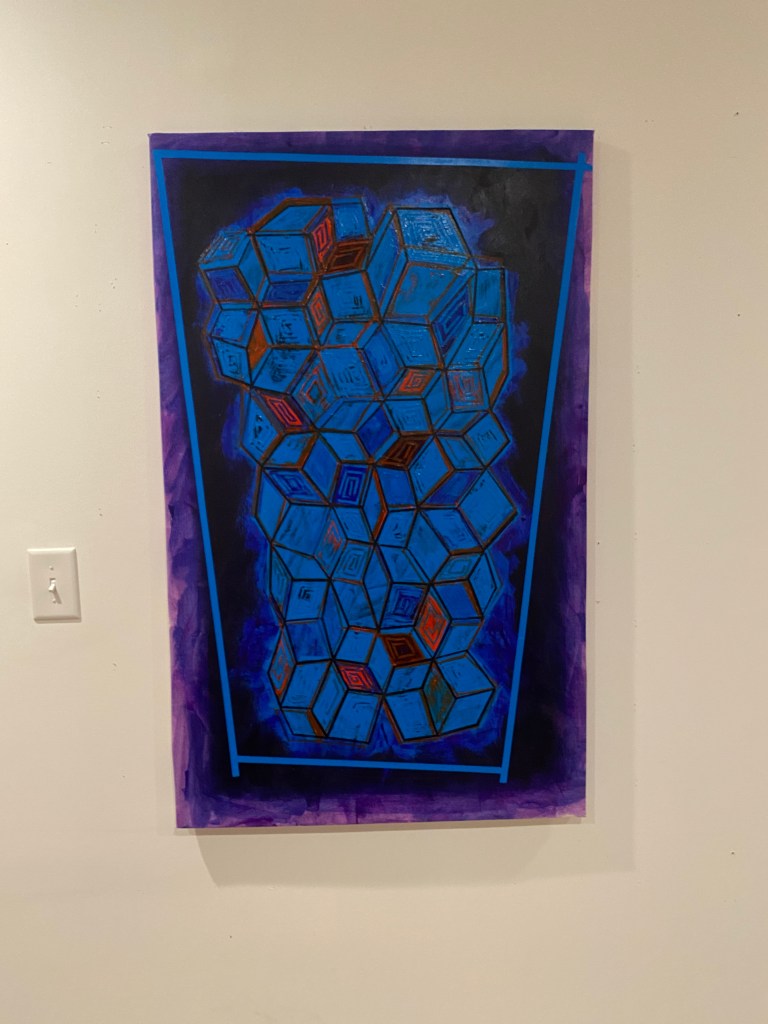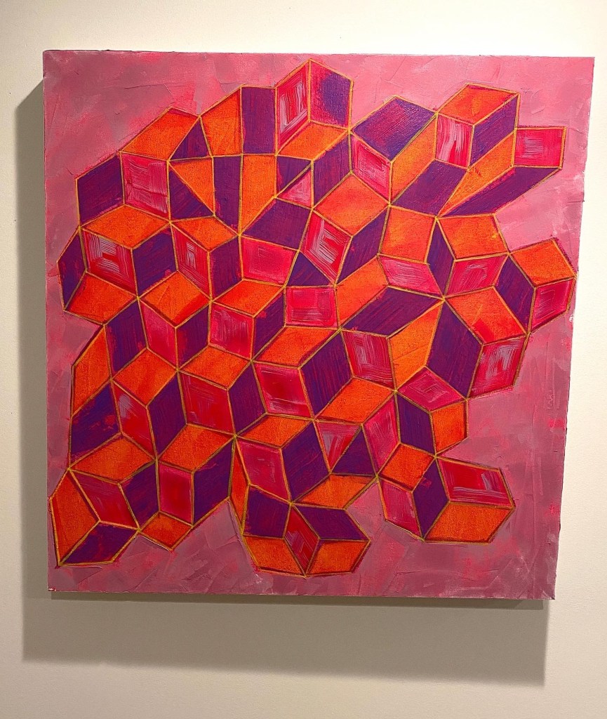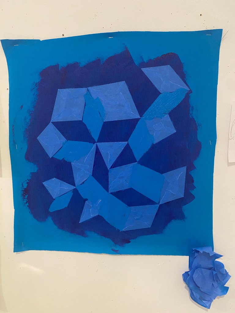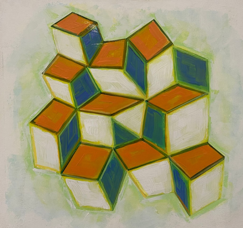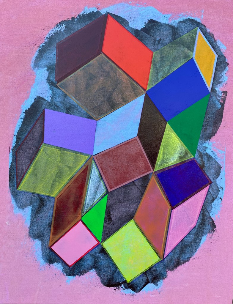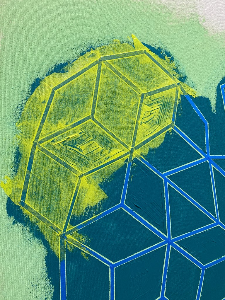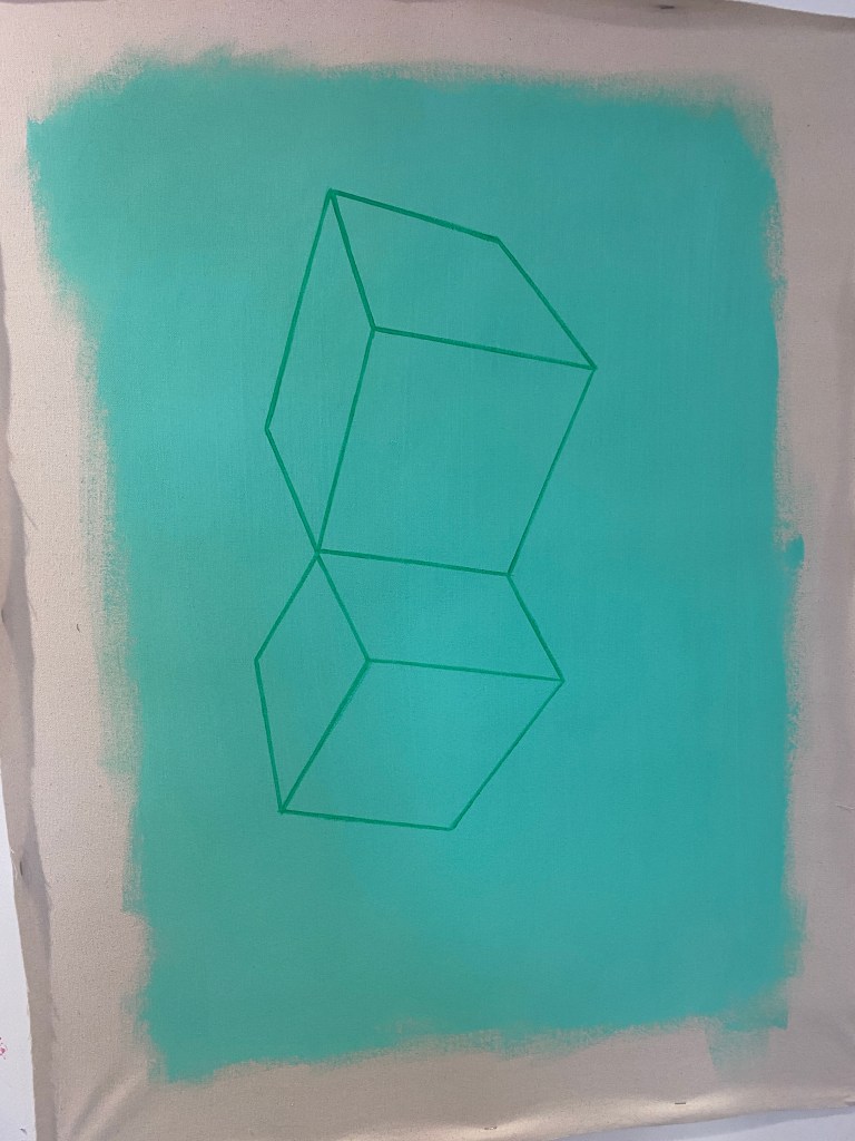 One other material that I have rediscovered recently is pastels. The left image below is a drawing I did that is the reason I began drawing my way through Oblique Strategies when I was feeling stuck. I hope the reader will agree that the color in this piece was worth exploring as a painting study (last row) that I’m pleased to report has ended, and there’s now a 5′ x 5′ piece of canvas stapled to the wall of my studio, ready for me to embark on a larger piece. I’m happy with the framework I’ve built for this one- lots of room to make in-the-moment decisions- and the composition will happen the way much good abstraction does, by stepping up to a blank canvas and being present in the moment. I will do the drawing using the overhead projector but only so that I can make slight tweaks to the size of the cubes, by changing the distance between the projector and the wall) if I desire.