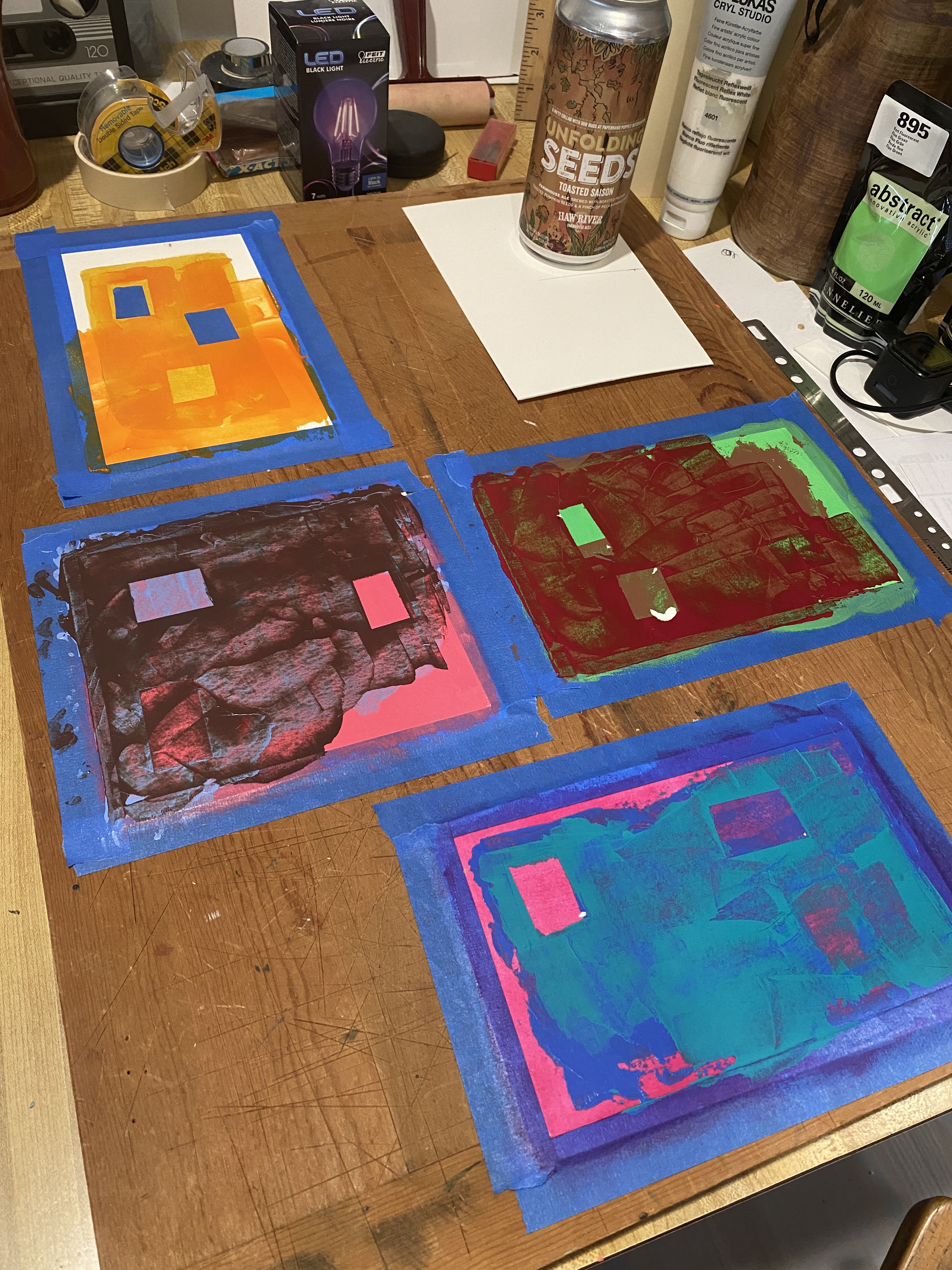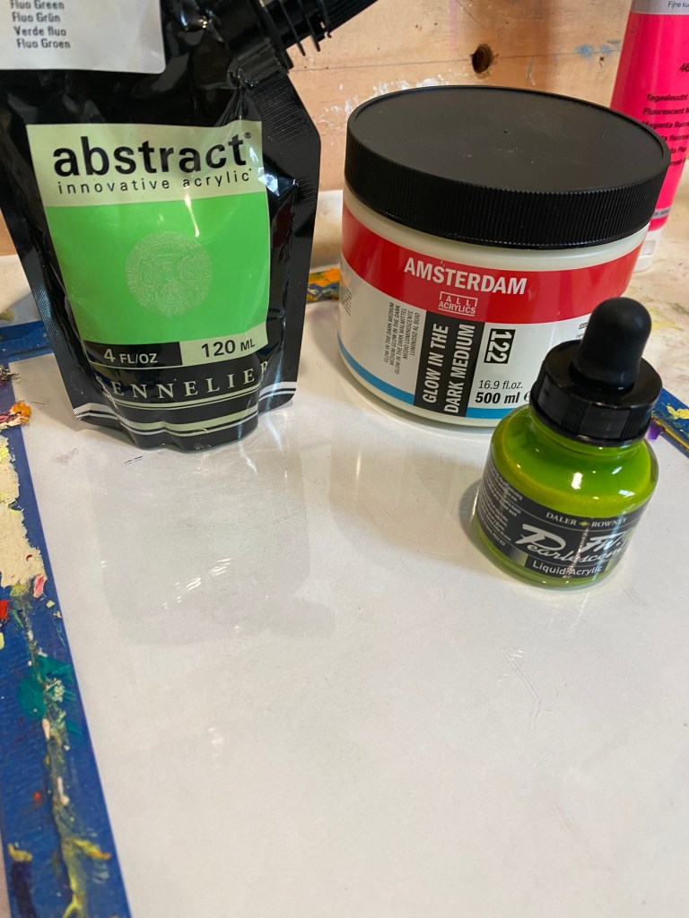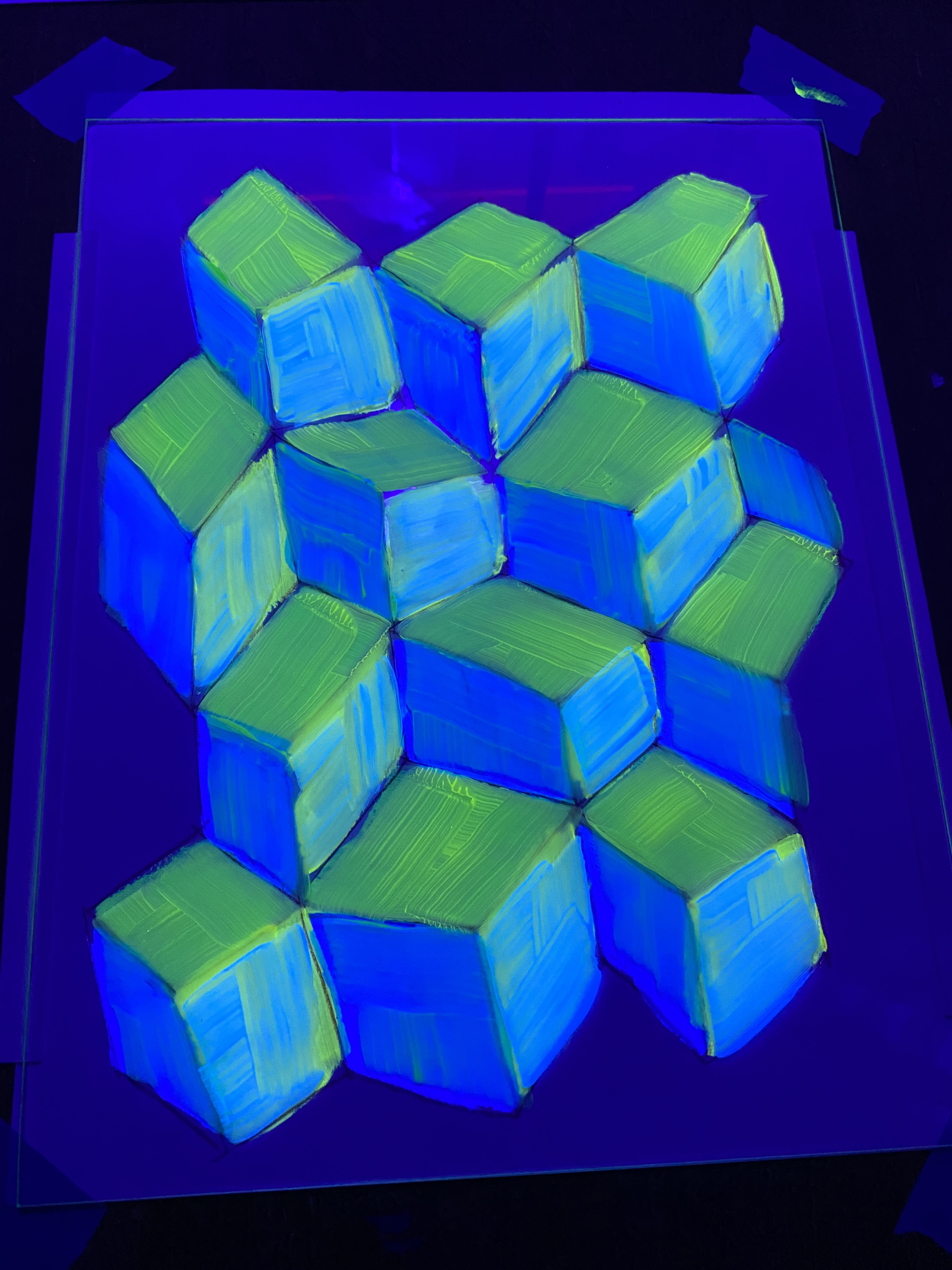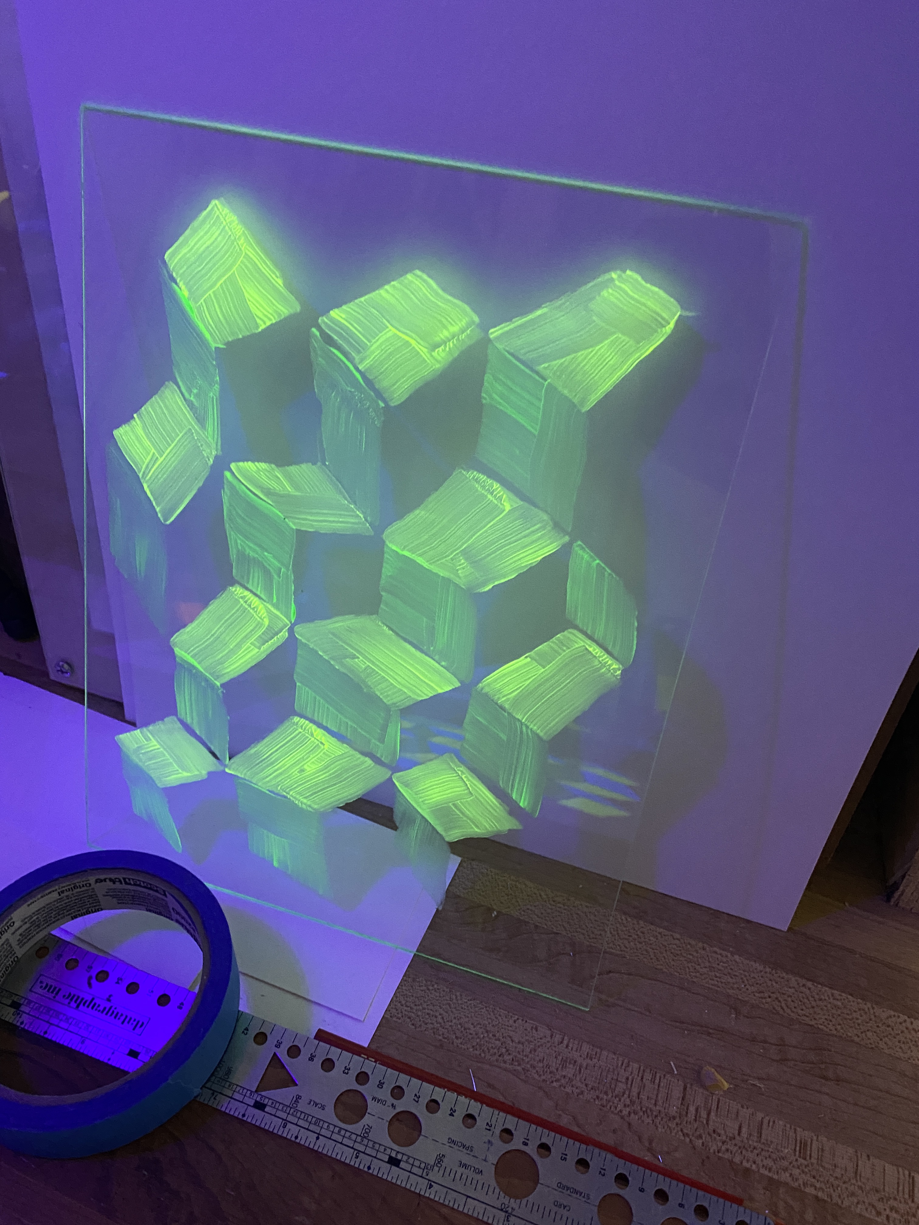 I do have a couple of new things in the works. In part based on the last, small body of (small) work that I completed (which I found also influenced by the hard edge work I was making 2 decades ago), as well as having a go with shaped canvases or at least containers (most of which have actually been discarded), I’ve found myself moving towards even more graphic painting elements. In particular, there is a small green and pink and purple study I’ve wanted to revisit. The main shift in direction is and will be rooted in my recent reflection on a specific condition of painting- that an implied light source is important (critical?) to understand the illusion in (a) painting, even in the case of an unnatural, fictitious space or place. I like the contradiction/duality of making work also appear to be a source of light, much the same way the stacking of cubes that rely on and deny gravity can be arresting. In addition, there is a pleasing and engaging duality created by having more than one appearance or set of visual characteristics for a painting, given different lighting. Plus, the need to change the lighting to view a work (turning on a black light, or in the case of photo-phosphorescent work, turning off the light) requires participation by an audience which, I think, emphasizes the experiential element of seeing art. Additionally, there is the duality that black-light art is not typically “high art” and gives a gentle entry point for more audiences (I’m totally good with “that’s cool” from the non-art crowd).