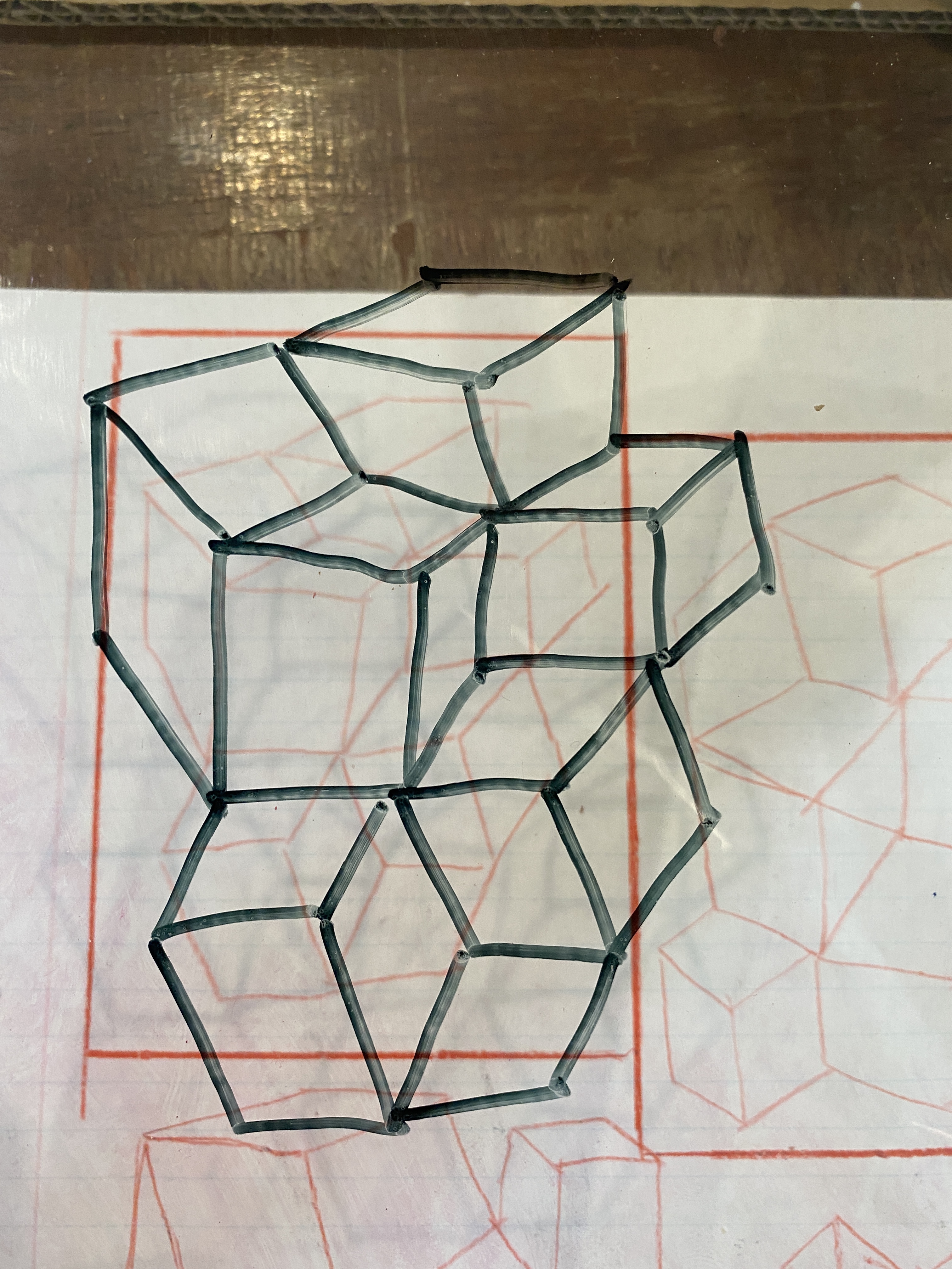 Above is a medium size piece based on the study on the top left and is a continuation of a larger piece from 2021 (also pictured). Planning to replicate the sporadic use of lighter and darker tones to make the viewer’s move around the structure.