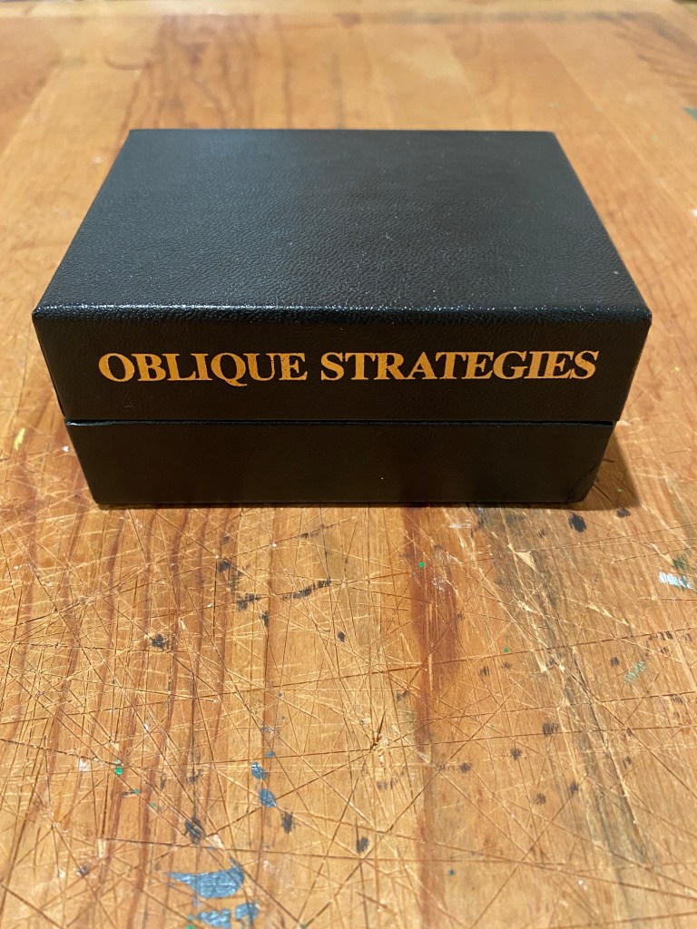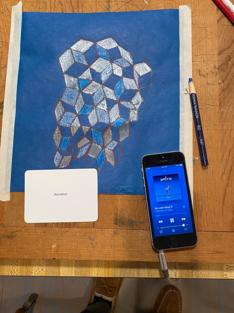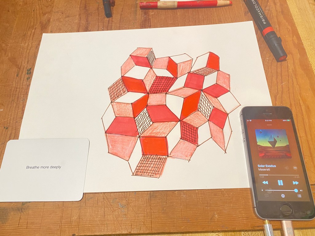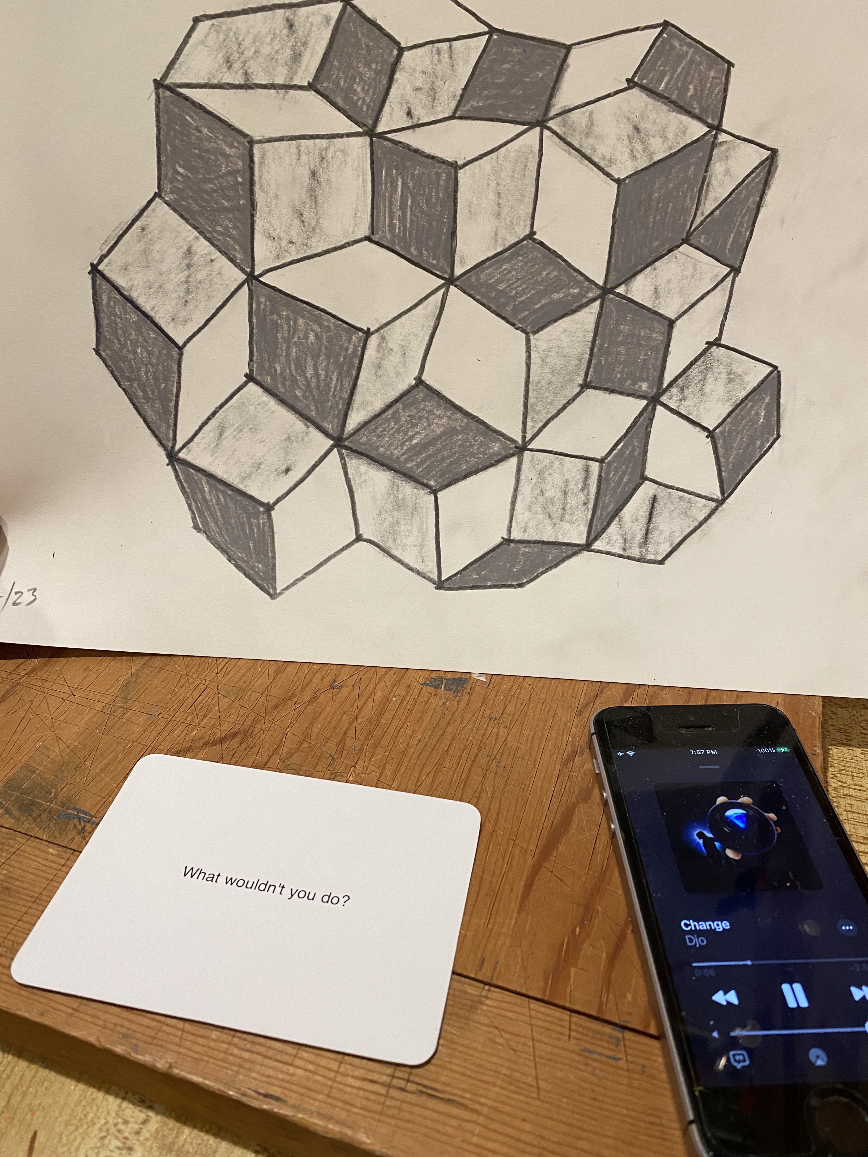 Back to trying to find a word to reflect on as part of an update. Thinking about this one- focus- because the intellectual exercise of drawing my way through Oblique Strategies has already shifted from my last update. After a scattered start I am finding it easier to use the prompts to think my way through my practice of drawing the cubes. I’ve also given the practice some “rules”: 1 drawing per day; pick drawing materials before the prompt; 15 minute time limit; photograph each drawing with the prompt and the music I was listening to while drawing; and journal briefly about the thought process immediately after.