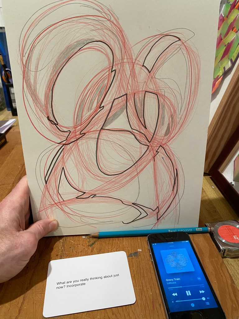 I’ve also started a new, (what I will strive to make a) daily practice of drawing, based on Brian Eno and Peter Schmidt’s Oblique Strategies. The end goal of this part of my practice will be some source material for another body of work that will incorporate black light and fluorescent paint. *Right out of the gate though, it looks like trying to open up by responding to word prompts and also to be more “automatic” in my approach to mark-making is going to lead to some quite divergent forms…