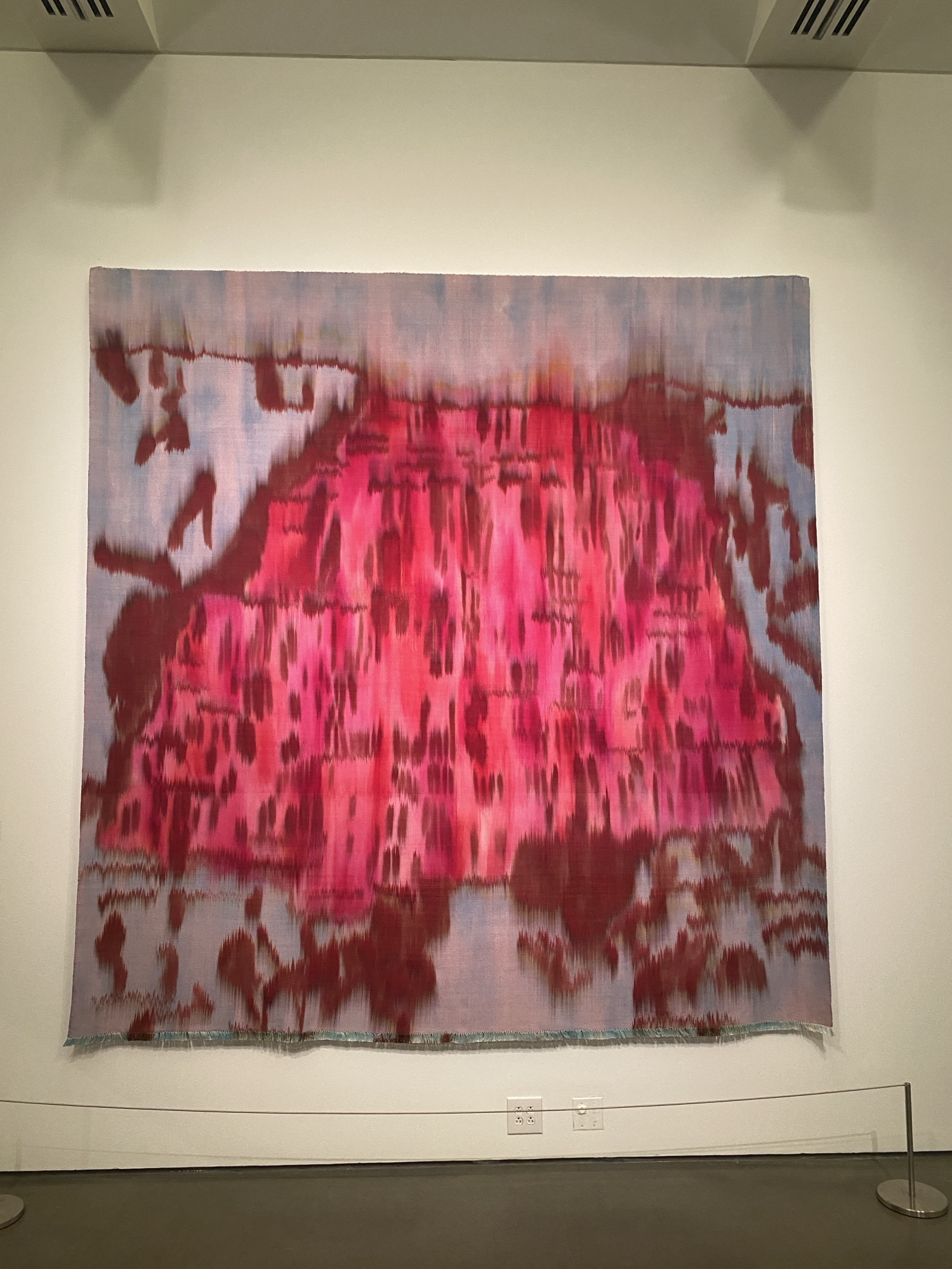 has an amazing exhibit up at the Bechtler. If you are in the Charlotte area any time soon I highly recommend it. The artist and her longtime assistant, Jillian Glass Braganza, dress a loom with silk yarn, a task that can take weeks for larger works. These threads, called the warp, will remain stationary on the loom during the weaving, but first, they are placed over the schematic drawing and soaked with water. Using fiber-reactive silk dyes, Jónsson either pours liquid in her desired colors onto the threads or dabs it on with a brush. While the warp threads are drying, Jónsson soaks and paints the weft threads, which will be drawn through and inserted over and under the warp, to run perpendicular along the length of the textile. When all the threads are dry, weft meets warp bit by bit on the loom, slowly bringing Jónsson’s painting into being.
