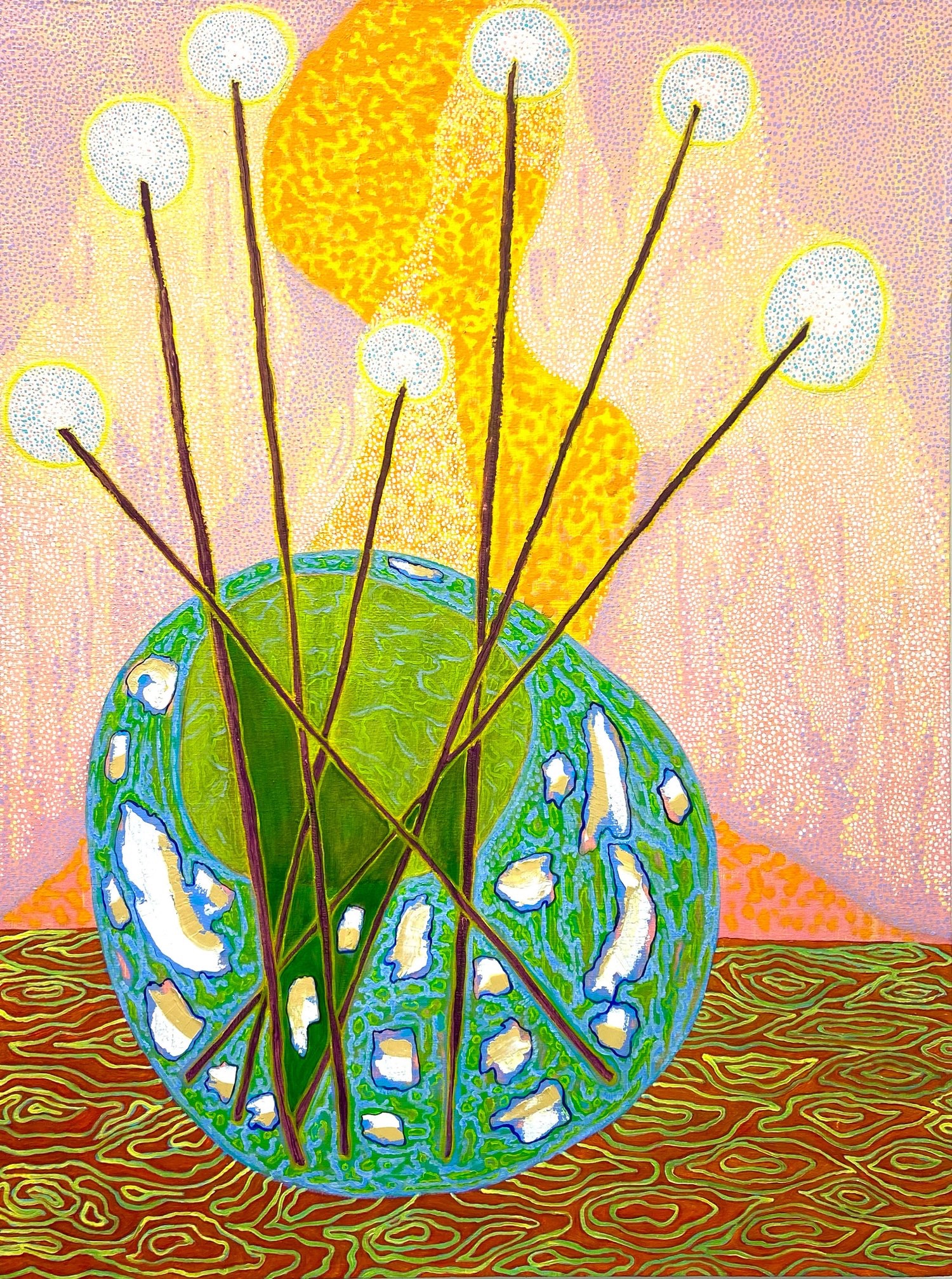 D’Arcy Simpson Art Works says of Joseph “The dense and textured canvases of Joseph Stabilito’s new body of work swirl with elements of anatomy, astronomy, technology and biology. He has created a vocabulary of marks and motifs that create expansive universes, depicting the conscious and unconscious states of human experience. “