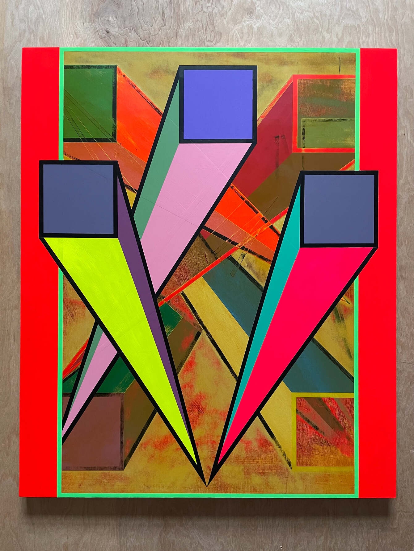 The Garage Art Center recently showed an exhibit of Richard’s work titled Around the Edges. He draws inspiration from Maine’s natural and man-made surroundings, including waterfronts, island shapes, and horizons, and he incorporates these into his work through distorted shapes and skewed perspectives. Completing several pieces at a time allows him to establish continuity in his works.