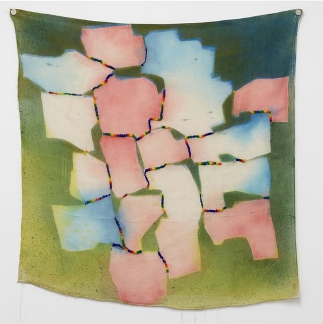 Artforum notes Whitney Claflin and Rochelle’s enduring engagement—personal and political, abstract and hyper-specific—with living in America. (Further) Feinstein stitched worming lines of hand-dyed, rainbow yarn into a group of drop cloth paintings that include American Sampler / 2020 (all works 2022), in which she uses the threads to trace the contours of a puzzle of light-washed red and blue state-like shapes. The stops and starts of colorful embroidery are garish and hopeful, like a last-ditch attempt to metaphorically heal the nation.