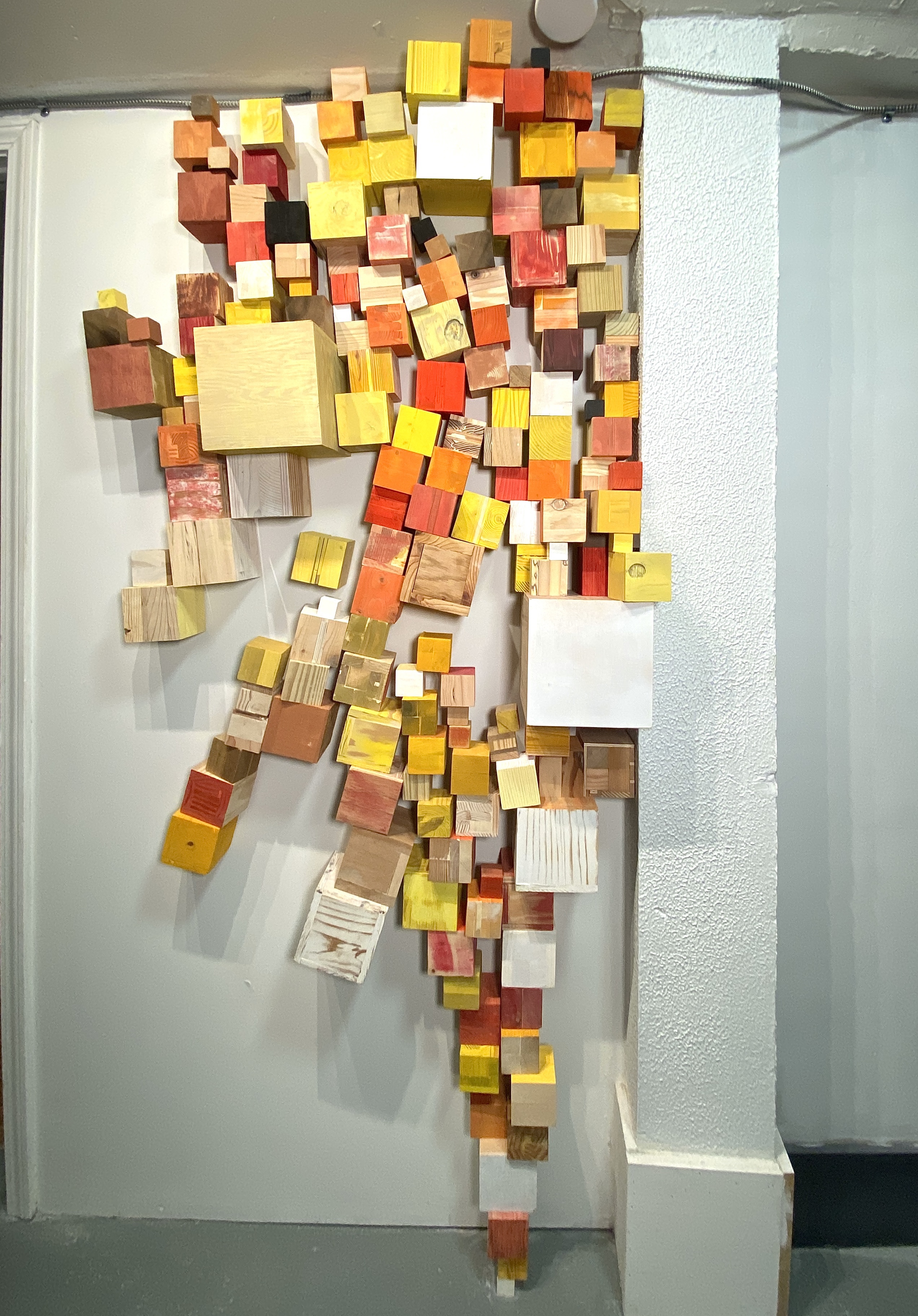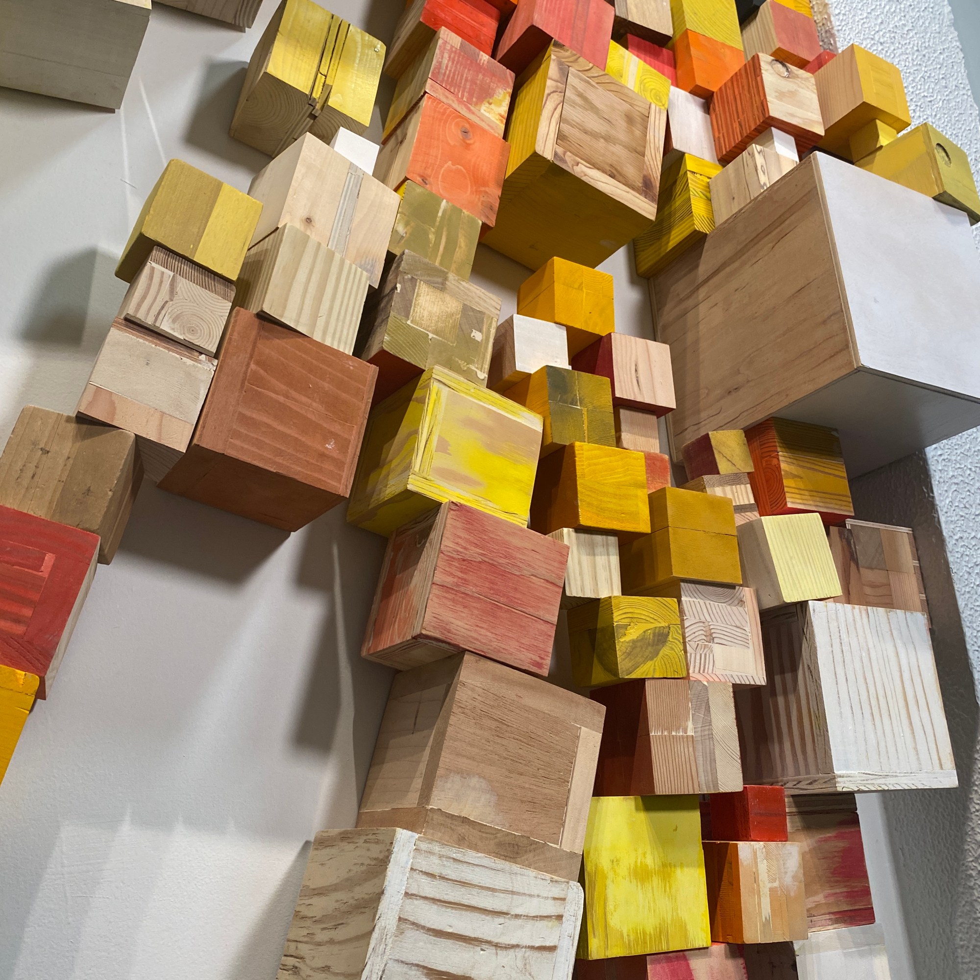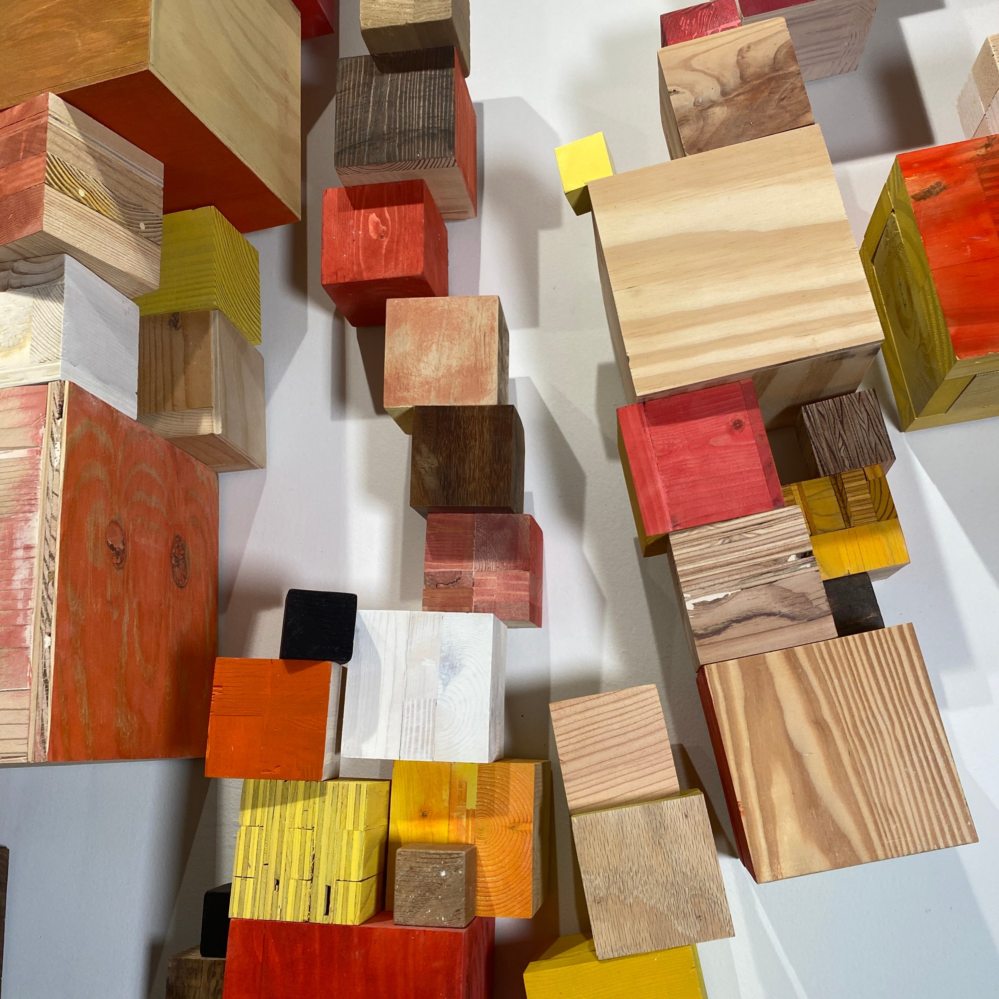 I’m including some detail shots below which I hope underscore that I do think of these physical cubes as proxies for brushstrokes, and the compositions as proxies for painting (after art is dead). There’s also a stop action animation of the install for the piece top left above at the bottom of this gallery- nothing is planned about these compositions. Yes, many of the aspects are chosen in advance (IE I have some rules) such as color and obviously shape. They are also temporary or time-limited- these 2 works will only exist in this configuration in this space and once the exhibit is done, they will be disassembled. To be a part of the experience of the work, you have to be present.