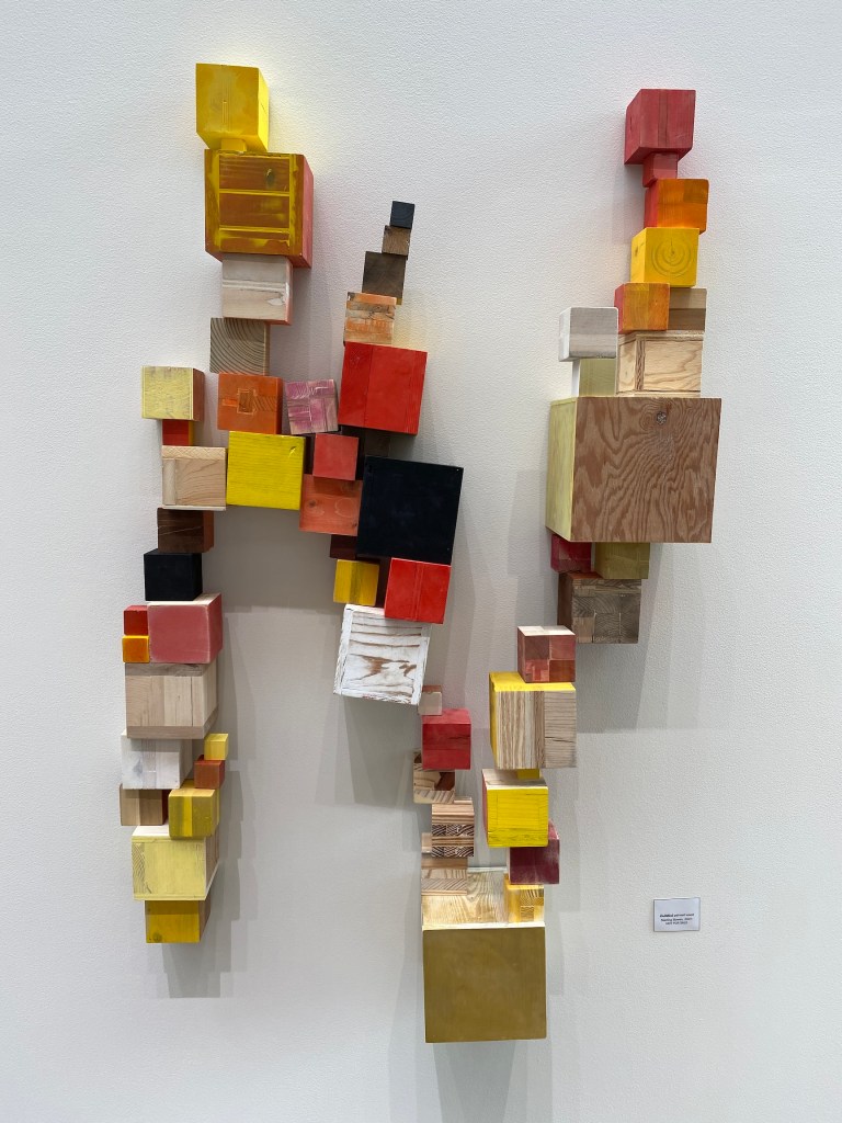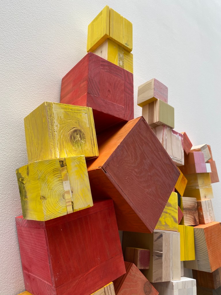 The object-making part of my practice is centered on an automatic “drawing” system. The work that results from this ongoing installation project is an extension of drawing onto the wall and into the third dimension, another contradiction. I treat the individual cubes as proxies for brush strokes or mark-making. Instead of traditional drawing modalities, I compose the work by choosing a cube, stacking it, and then repeating this process until the space allotted for the “drawing” is filled. As with all automatic drawing, no planning or intended end is envisioned for any instance of the work, making it an experience for me, and for the audience.