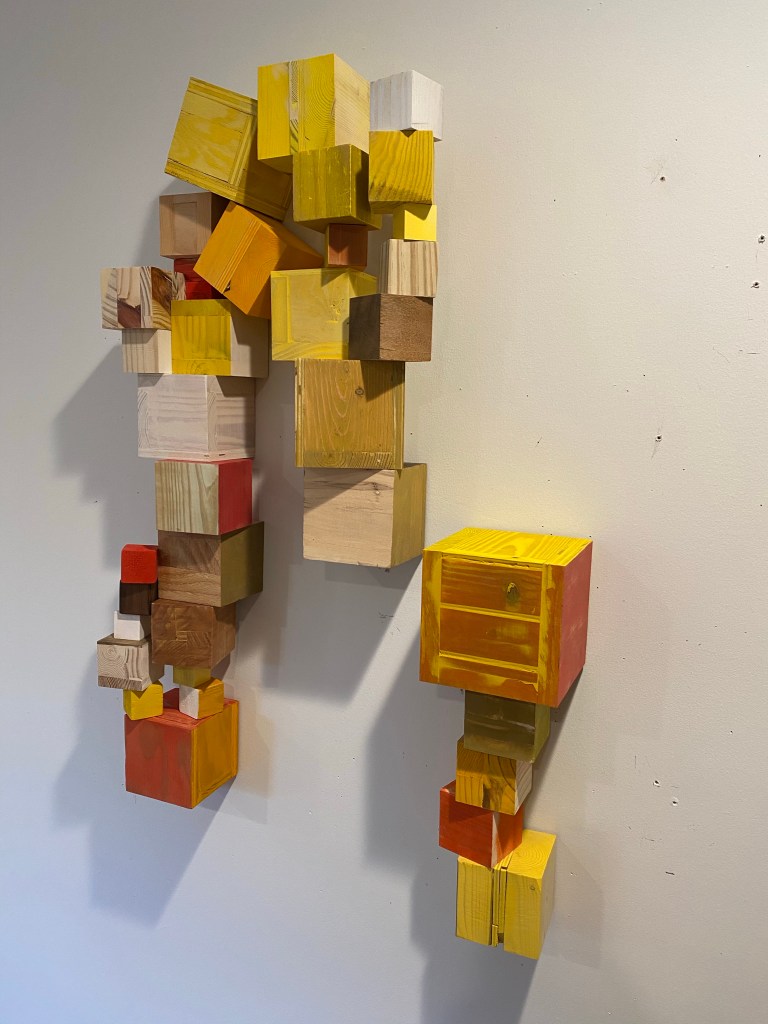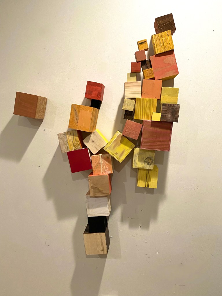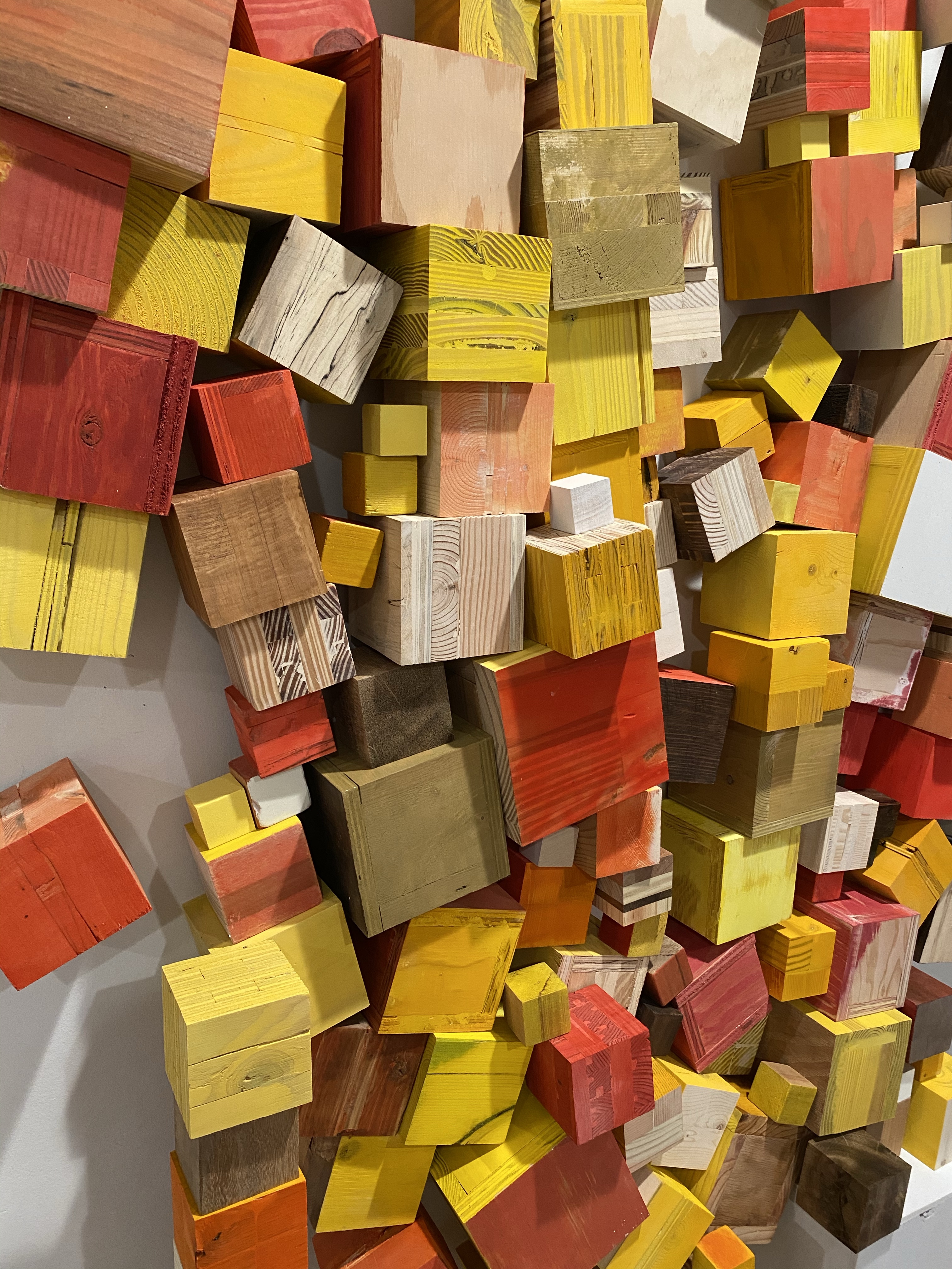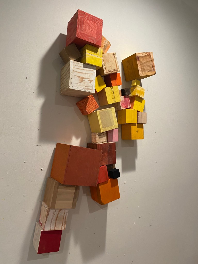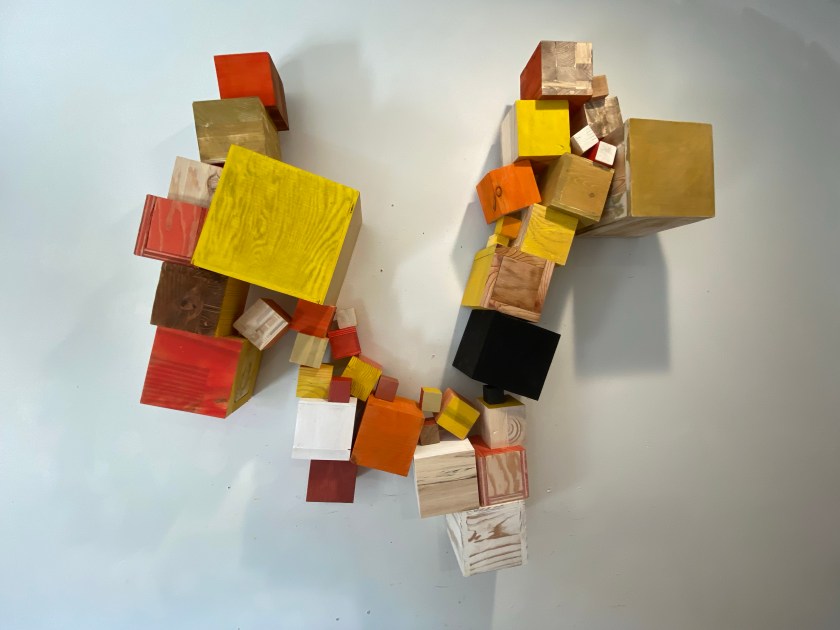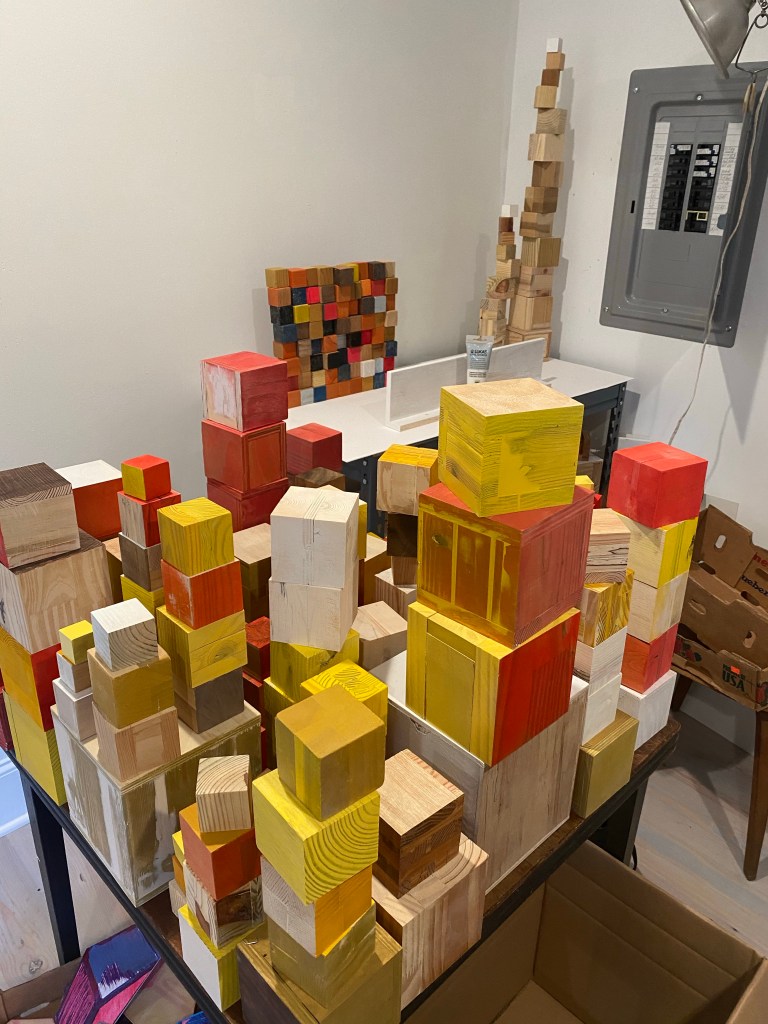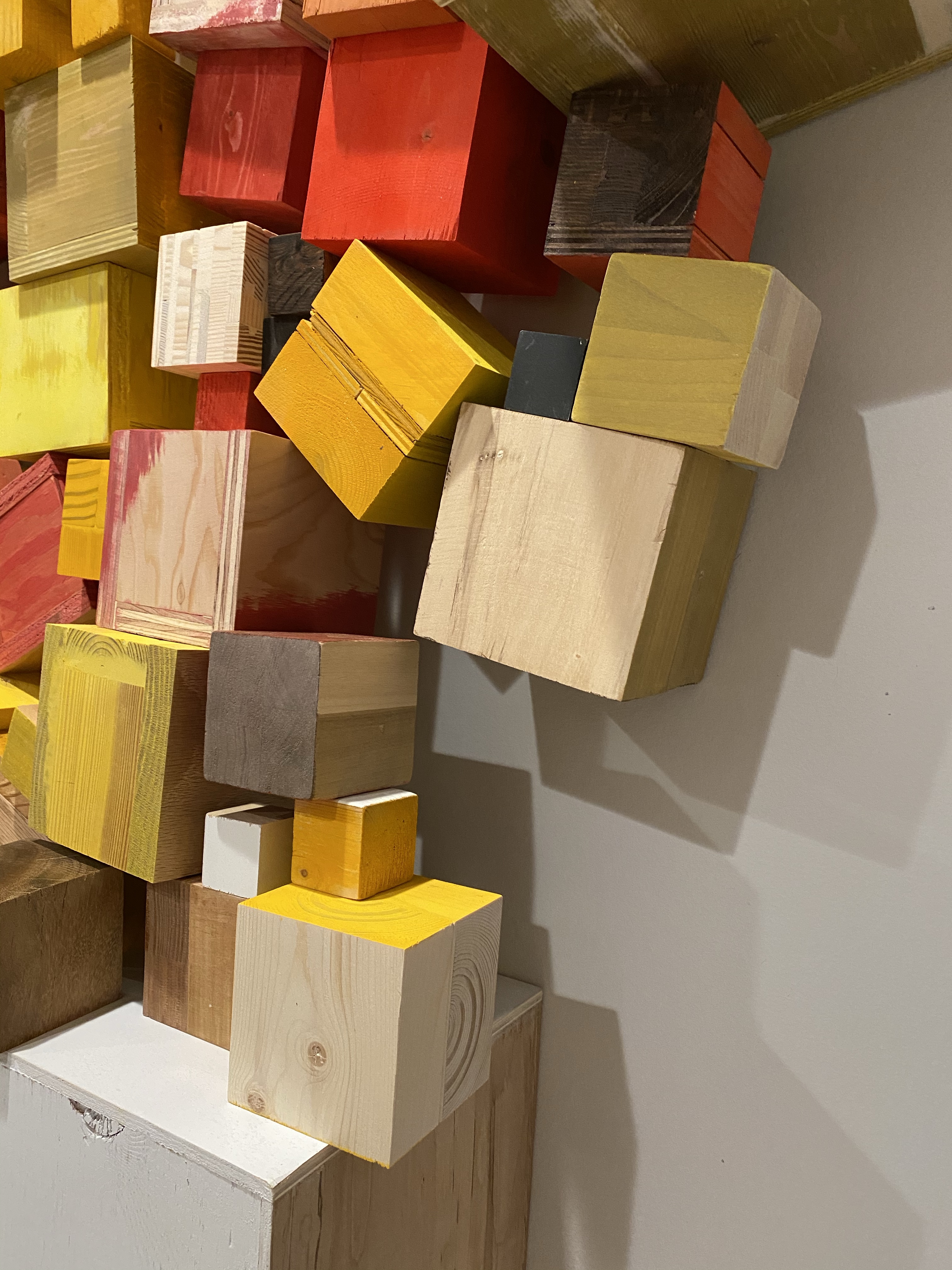 I’m including some detail shots below which I hope underscore that I do think of these physical cubes as proxies for brushstrokes, and the compositions as proxies for painting (after art is dead). There’s also a stop action animation of the install for the piece top left above at the bottom of this gallery- nothing is planned about these compositions. Yes, many of the aspects are chosen in advance (IE I have some rules) such as color and obviously shape. They are also temporary or time-limited- these 2 works will only exist in this configuration in this space and once the exhibit is done, they will be disassembled. To be a part of the experience of the work, you have to be present.