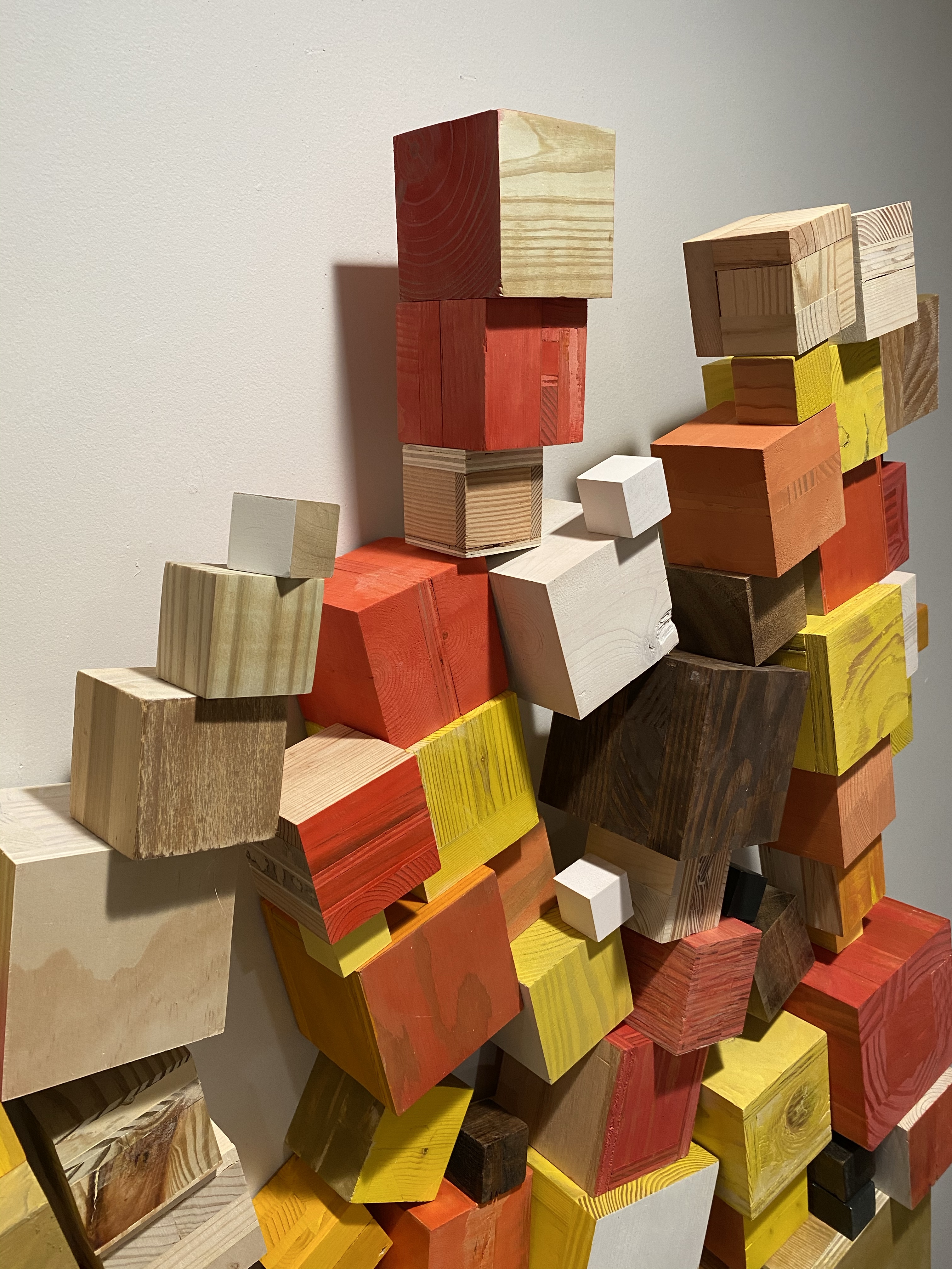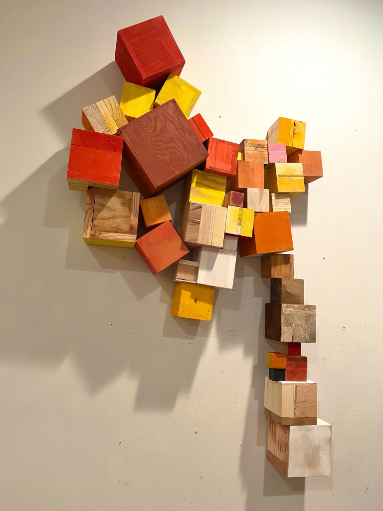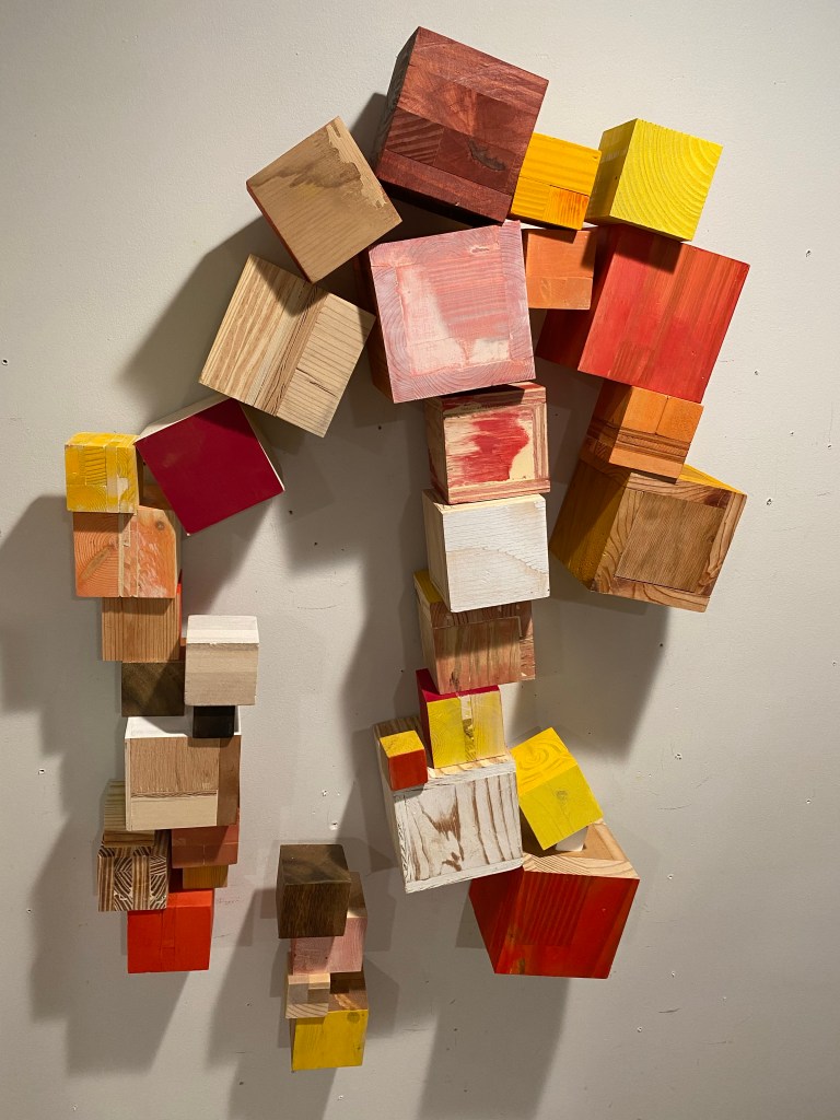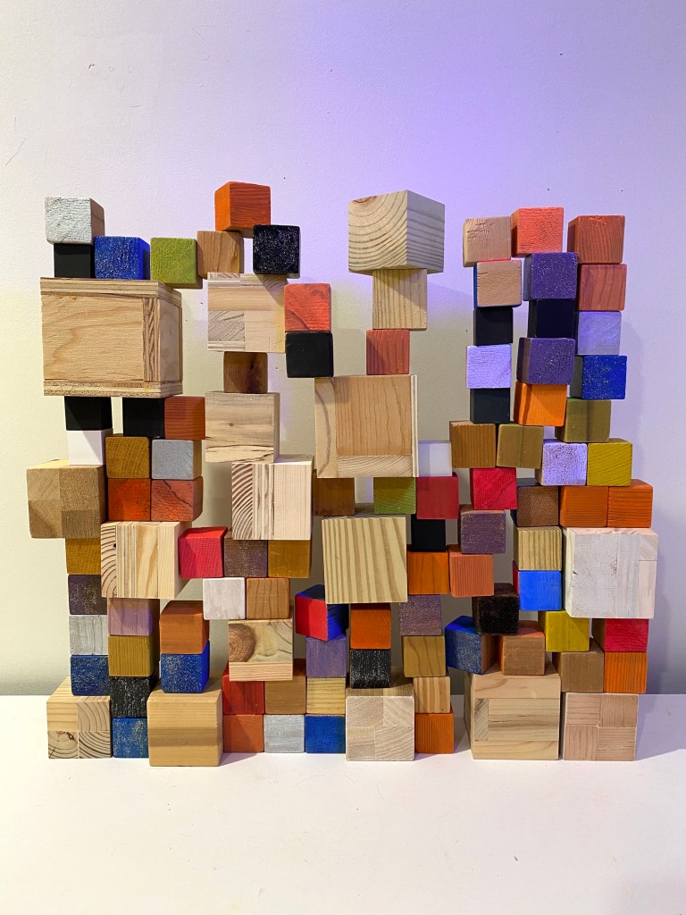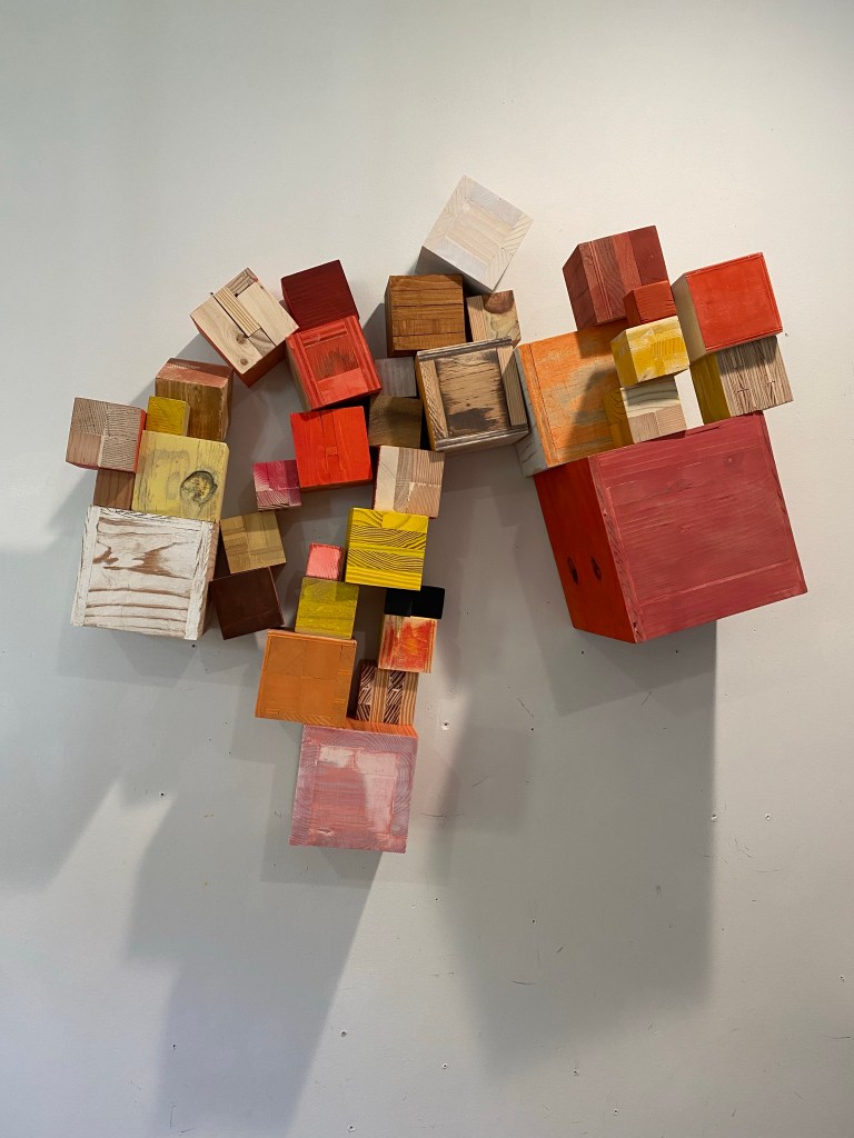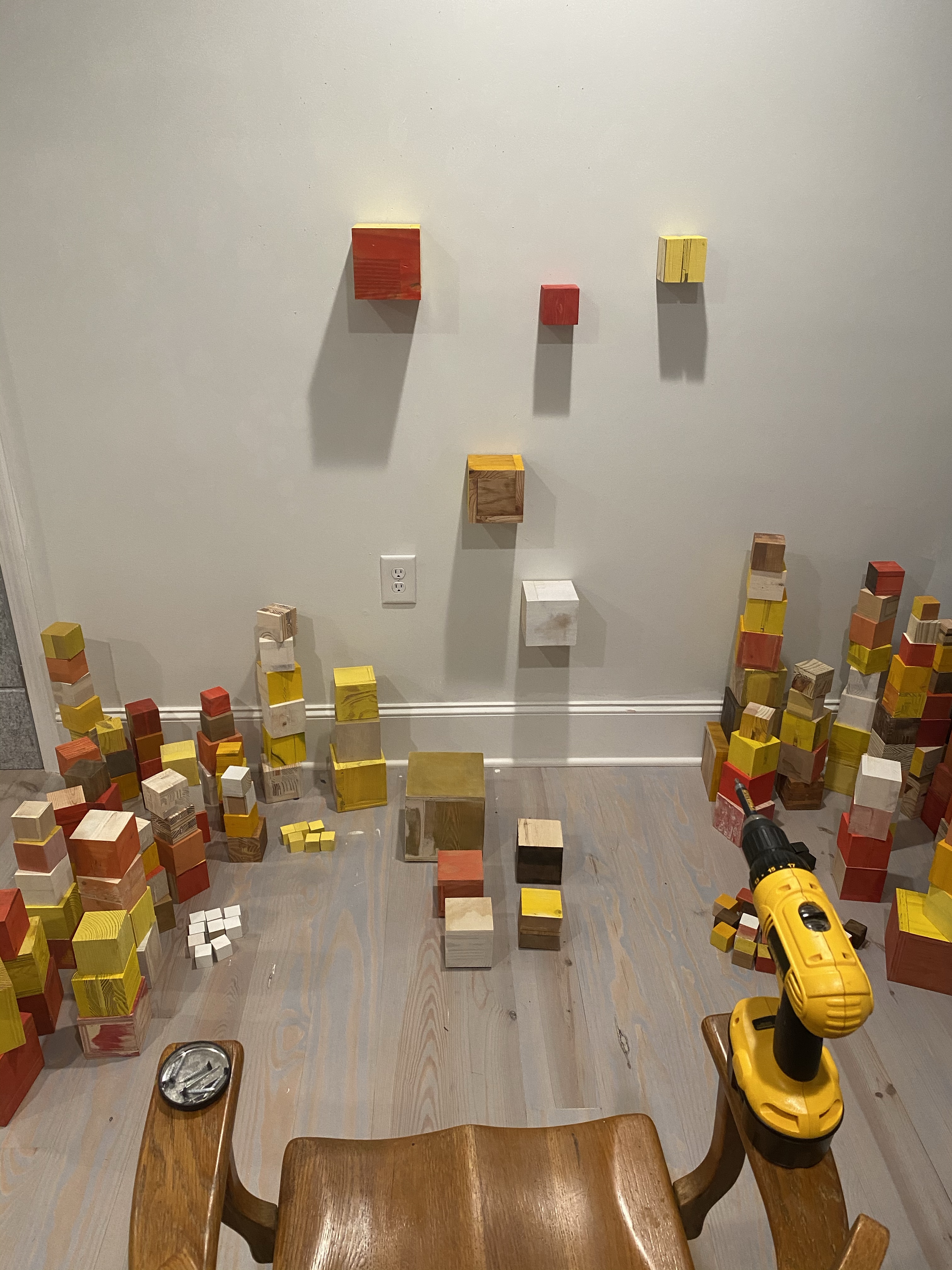 I’m including some detail shots below which I hope underscore that I do think of these physical cubes as proxies for brushstrokes, and the compositions as proxies for painting (after art is dead). There’s also a stop action animation of the install for the piece top left above at the bottom of this gallery- nothing is planned about these compositions. Yes, many of the aspects are chosen in advance (IE I have some rules) such as color and obviously shape. They are also temporary or time-limited- these 2 works will only exist in this configuration in this space and once the exhibit is done, they will be disassembled. To be a part of the experience of the work, you have to be present.