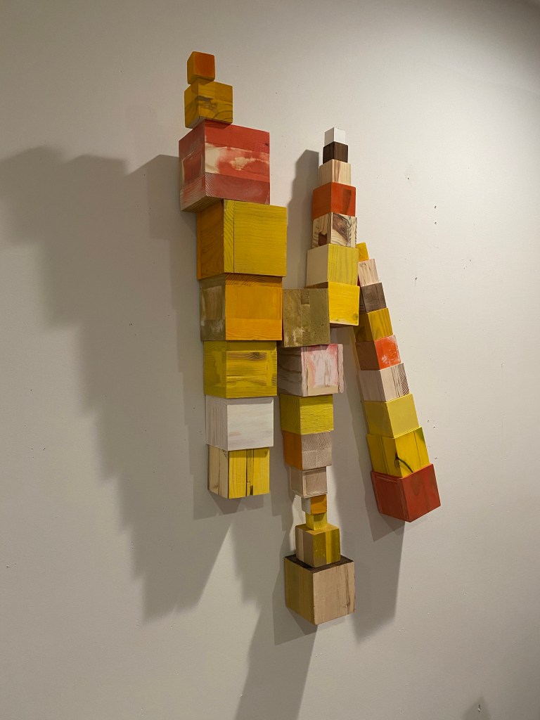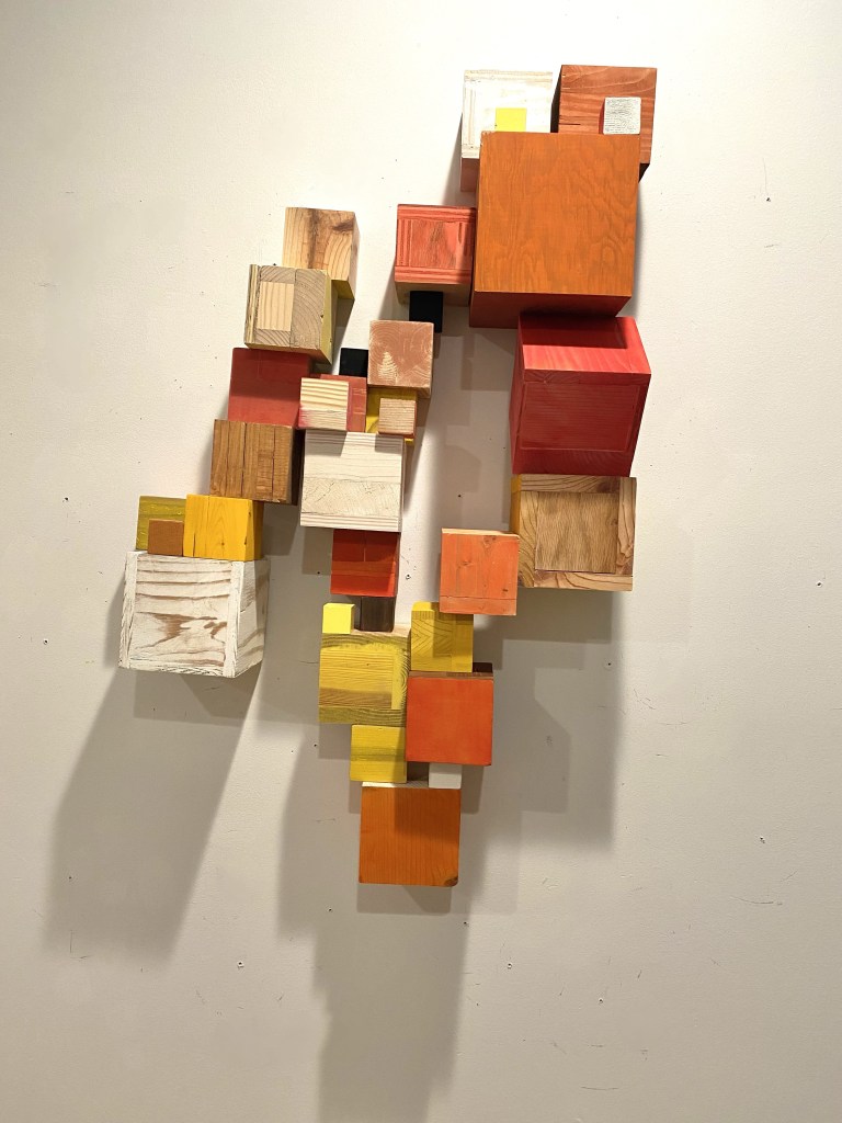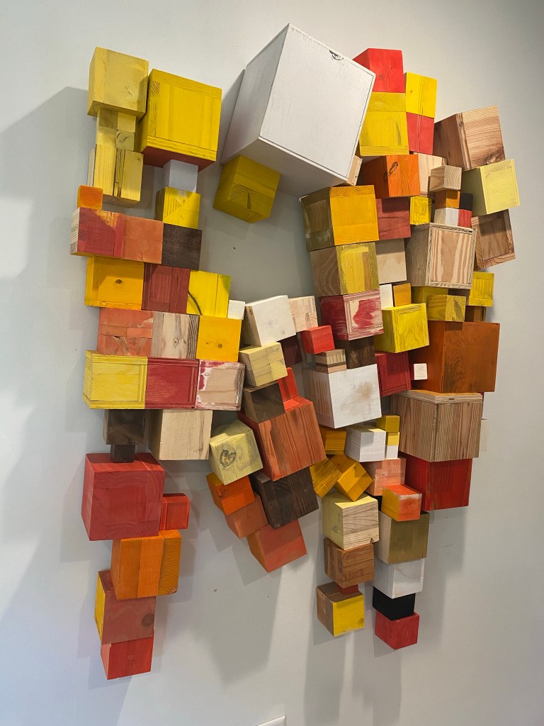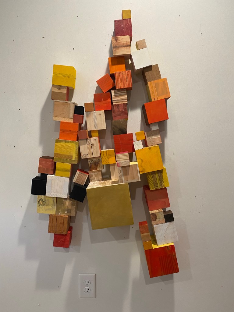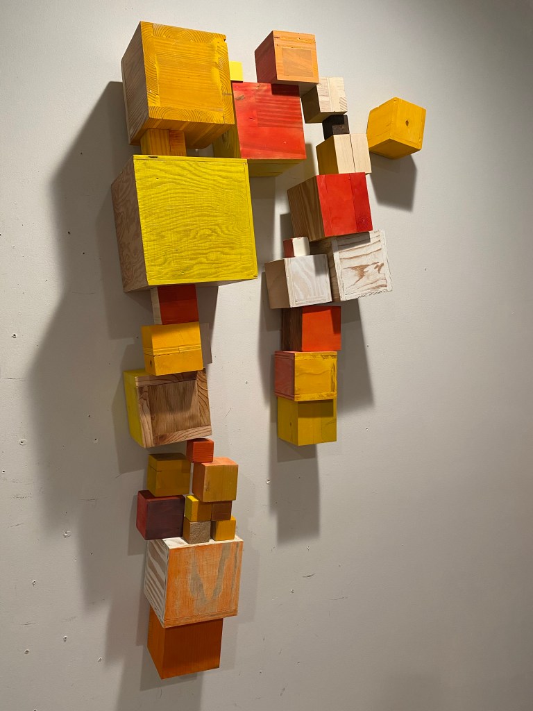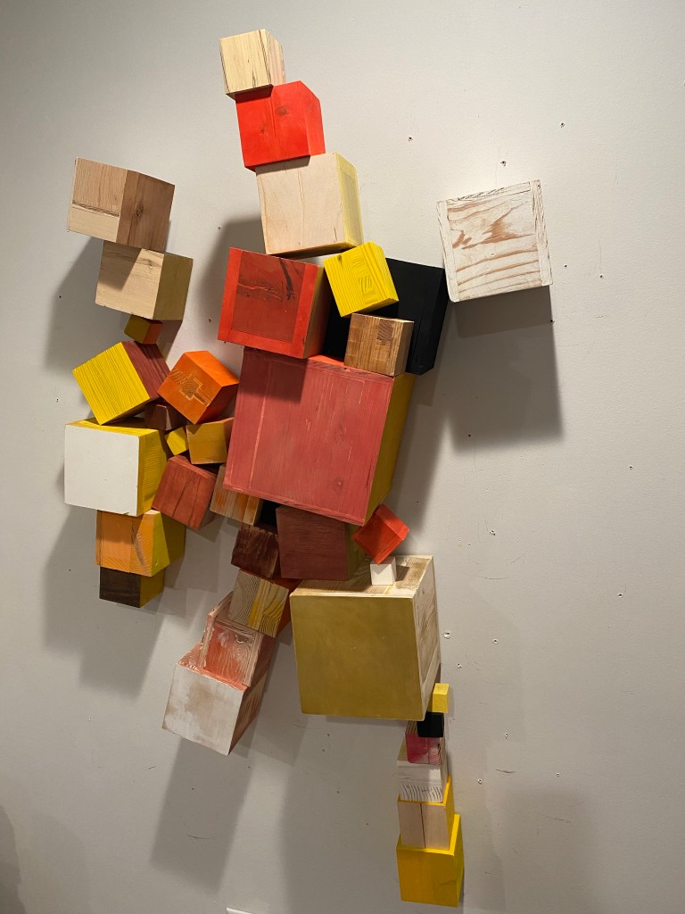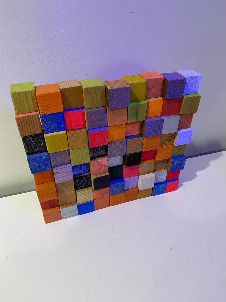 I’m including some detail shots below which I hope underscore that I do think of these physical cubes as proxies for brushstrokes, and the compositions as proxies for painting (after art is dead). There’s also a stop action animation of the install for the piece top left above at the bottom of this gallery- nothing is planned about these compositions. Yes, many of the aspects are chosen in advance (IE I have some rules) such as color and obviously shape. They are also temporary or time-limited- these 2 works will only exist in this configuration in this space and once the exhibit is done, they will be disassembled. To be a part of the experience of the work, you have to be present.
