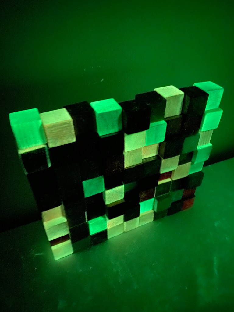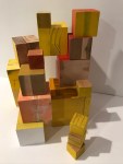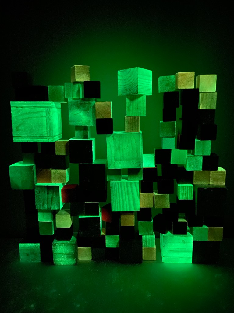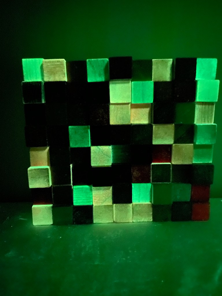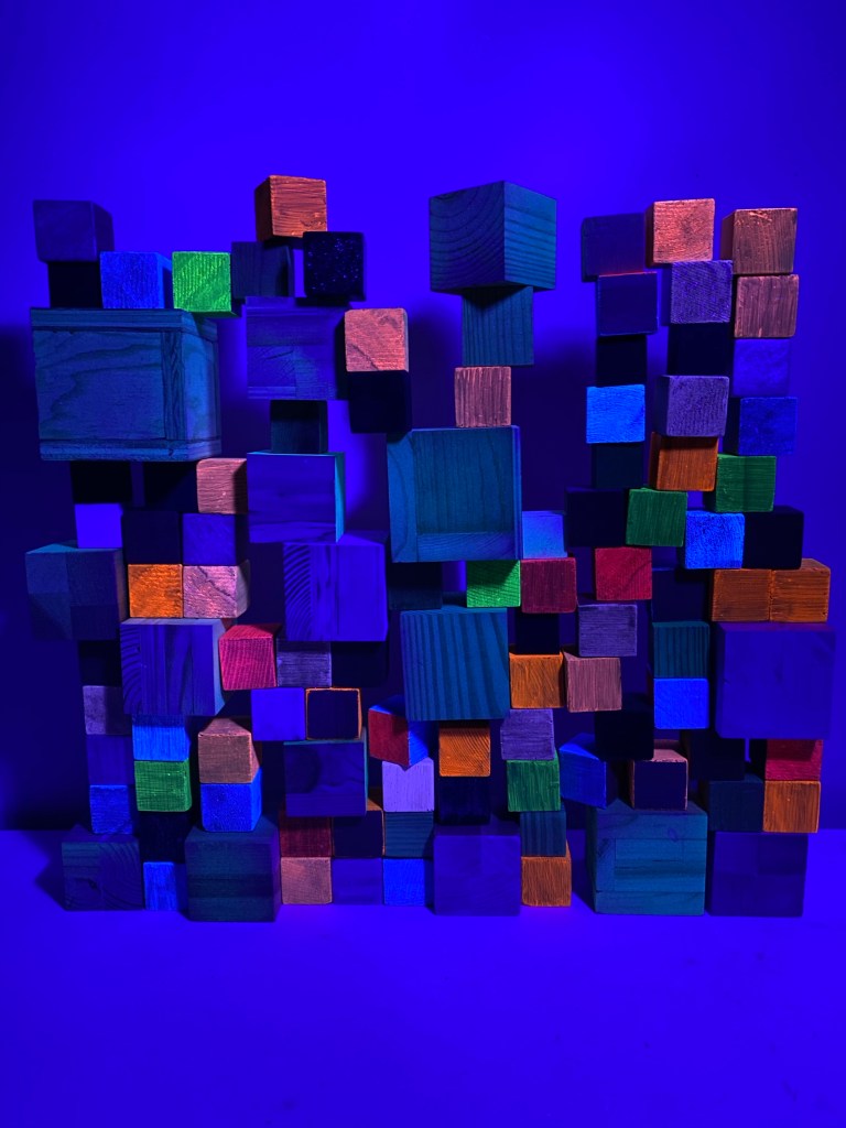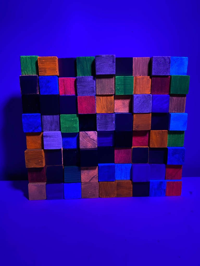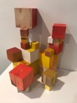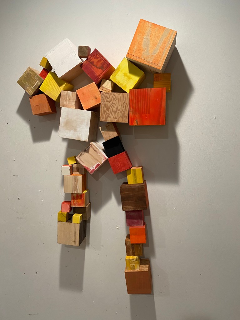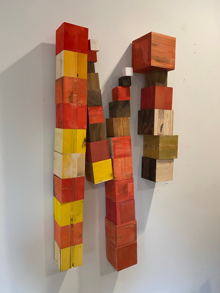 I’m including some detail shots below which I hope underscore that I do think of these physical cubes as proxies for brushstrokes, and the compositions as proxies for painting (after art is dead). There’s also a stop action animation of the install for the piece top left above at the bottom of this gallery- nothing is planned about these compositions. Yes, many of the aspects are chosen in advance (IE I have some rules) such as color and obviously shape. They are also temporary or time-limited- these 2 works will only exist in this configuration in this space and once the exhibit is done, they will be disassembled. To be a part of the experience of the work, you have to be present.