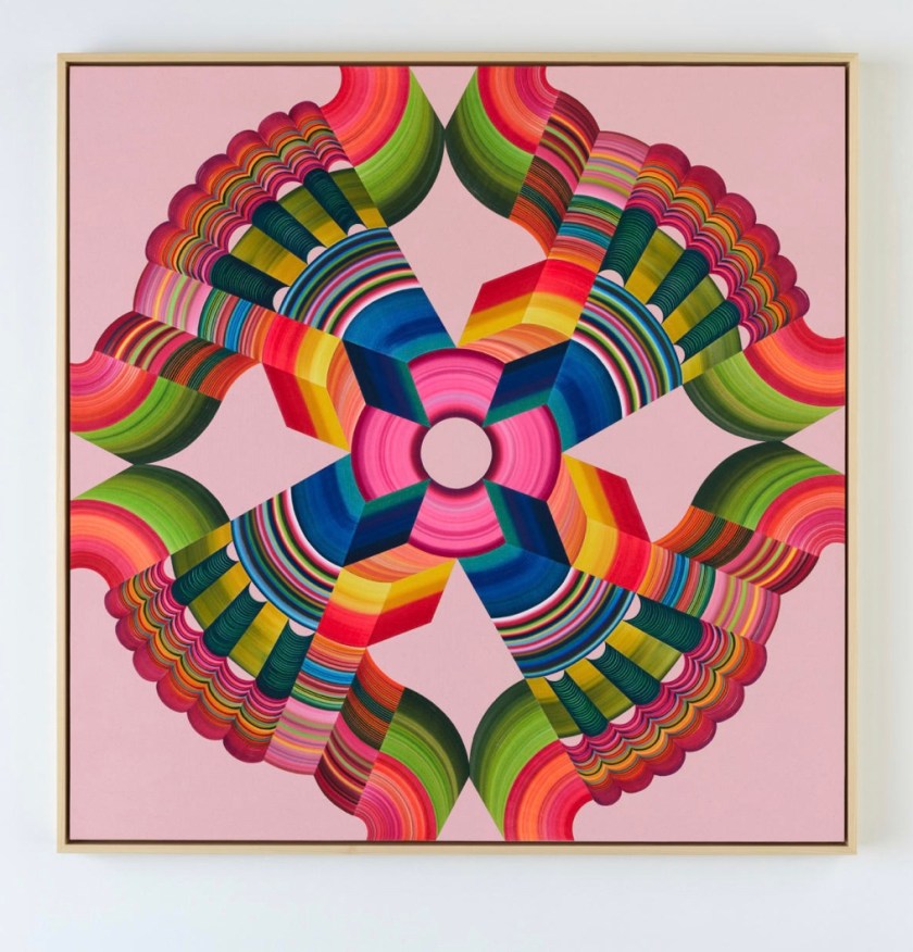 Hyperallergic says Fleming’s geometric paintings are not the Minimalism of Greenberg and Judd, with their insistence on flatness and the elimination of space in painting.